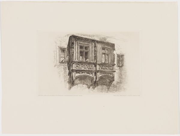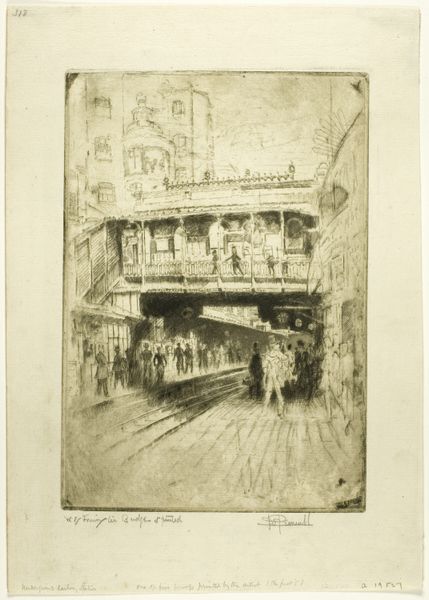 Editor: Here we have James Abbott McNeill Whistler's etching "Bloemenwinkel," created between 1892 and 1893. It's a delicate line drawing of what appears to be a flower shop. It's a pretty piece but hard to decipher at first glance. What details should viewers pay attention to? Curator: I'd say, let yourself sink into it. It's less about perfectly clear details and more about a feeling, an impression – just as Whistler wanted. Notice how the archways seem to frame a moment, not just a shop. The sketchy lines invite you to complete the image in your mind. What kind of atmosphere do you perceive here? Does it seem vibrant? Bustling? Editor: I get a sense of both stillness and liveliness at the same time. Like a paused scene from a busy day, especially with those figures clustered to the left. How did he capture the light using just lines? Curator: That’s Whistler's genius! Etching allowed him a phenomenal range of tonal variation using only line. See how densely packed the lines are in the darker areas versus the sparser, lighter ones? It is about visual suggestion, creating shadows that are delicate and ephemeral, which mirrors how we really perceive a scene, filtered through our minds, not a sharp photo. Are there elements that remind you of something, anything? Editor: It has this wonderfully timeless quality. The architectural elements remind me of photos of Venice. But the flower shop creates more immediate and everyday feeling. It’s beautiful how those two impressions meet. Curator: Yes, he’s often capturing moments in European cities. His compositions tend to feel very immediate and present; even with their historical settings. I'm glad you recognized that feeling! Editor: That mix of capturing fleeting moments using timeless settings makes perfect sense to me now. Thank you for pointing it out. Curator: And thank you! Seeing a work with fresh eyes always gives me a renewed perspective on art history.