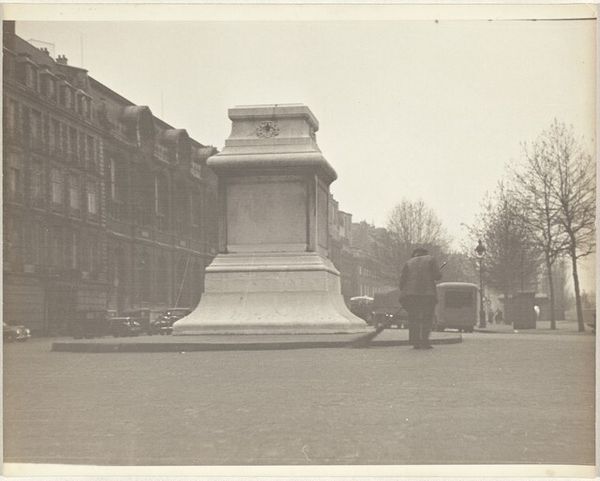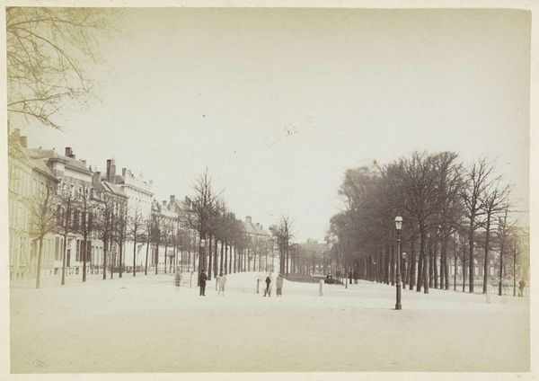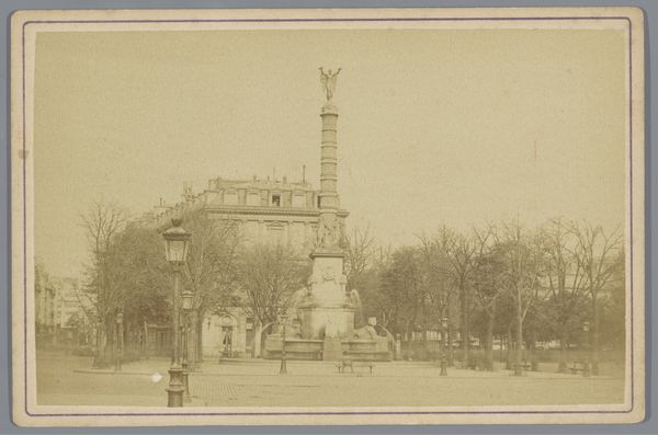 Editor: Here we have a photograph from around 1865-1870 by Andries Jager, titled "Gedenkteken voor de Hertog van Saksen Weimar aan het Lange Voorhout in Den Haag"—which translates to "Memorial to the Duke of Saxe-Weimar on the Lange Voorhout in The Hague". It feels incredibly formal, with that statue looming large in the middle of what I imagine is a very important square. How should we interpret such a deliberately posed image in a public space? Curator: The very existence of a photograph like this speaks to the increasing importance of public art and its representation. Photography in the mid-19th century served not only to document but also to disseminate idealized images of power and civic virtue. Think about the purpose of such monuments: they were intended to shape public memory and reinforce particular narratives of leadership. Editor: So, the photo isn't just capturing a statue, it's capturing an *idea* of leadership? Curator: Precisely. Consider where this monument is placed—a prominent location within The Hague, suggesting its intended audience was the public itself. Ask yourself, who was the Duke of Saxe-Weimar and what values did this monument aim to project? How might the social and political context of the time have influenced its design and reception? Editor: I guess the city wanted to broadcast certain ideals of the Duke and what he stood for to the public? Curator: Exactly. The choice to create a statue, and then photograph it for wider distribution, points to a carefully managed public image. What might that image have been aiming to convey? Was it successful? Editor: This has definitely made me see beyond the simple documentation and appreciate how carefully the image would have been planned! Curator: And remember, the act of photographing the monument transforms it further, allowing it to be consumed and understood within a broader cultural landscape. Think about who might have seen this image and what message they were meant to take away from it.