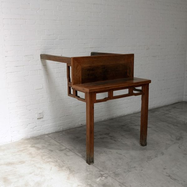 Curator: Here we have Deimantas Narkevicius’s object, "Never Backwards," currently residing in the Tate Collections. It strikes me as a strangely muted sculpture. Editor: It certainly has an odd feeling, something almost melancholic. The bars evoke a sense of confinement, but the pale color palette softens the impact. Curator: Narkevicius, born in 1964, often explores themes of memory and the weight of history through his works. This piece, I think, uses the form of a child’s crib as a potent symbol. Editor: A crib implies innocence and beginnings, but the title "Never Backwards" suggests resistance to regression, a kind of forced march forward. The olive green end, so different from the wood, feels significant. Curator: Perhaps the green is a marker of change, contrasting with the natural wood that may represent tradition. It points to the tensions between the past and the desired trajectory of the future. Editor: It's a subtle dialogue between comfort and constraint, isn’t it? Curator: Precisely, it's an invitation to consider how societal progress impacts individual experience. Editor: The piece definitely leaves a lasting impression. It is sparse and evocative.