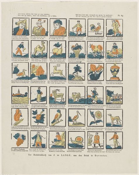 This print titled '80 Verscheidenheden / 80 Sujets divers' was created by Brepols & Dierckx Zoon, in Turnhout, Belgium. It presents a diverse collection of everyday objects, animals, and figures, rendered in a style reminiscent of children’s book illustrations. Prints like this provide a fascinating window into the material culture and visual language of their time. The careful arrangement and depiction of these "80 varieties" likely speak to the growing industrialization and consumer culture of 19th-century Europe. The dual titles in both Dutch and French suggest a society navigating its own multilingualism and multiculturalism, as does the rather eclectic range of the objects depicted. It also hints at Belgium’s complex history and its position as a crossroads of European cultures. The very act of cataloging and illustrating these subjects points to a desire to classify and understand the world. To truly understand this print, one might turn to trade catalogs, social histories of childhood, or even studies of early advertising and marketing. The meaning of this image is always contingent on the social and institutional contexts in which it was made and received.