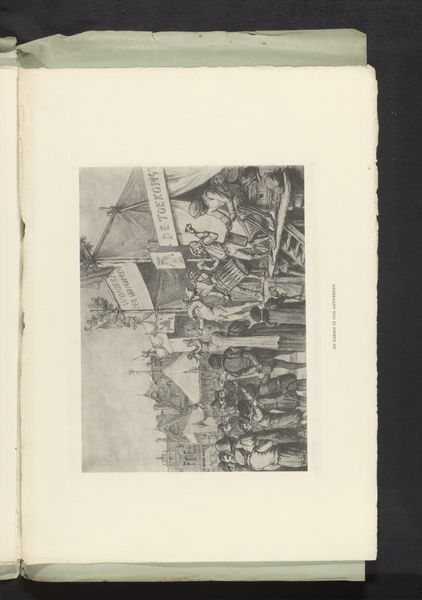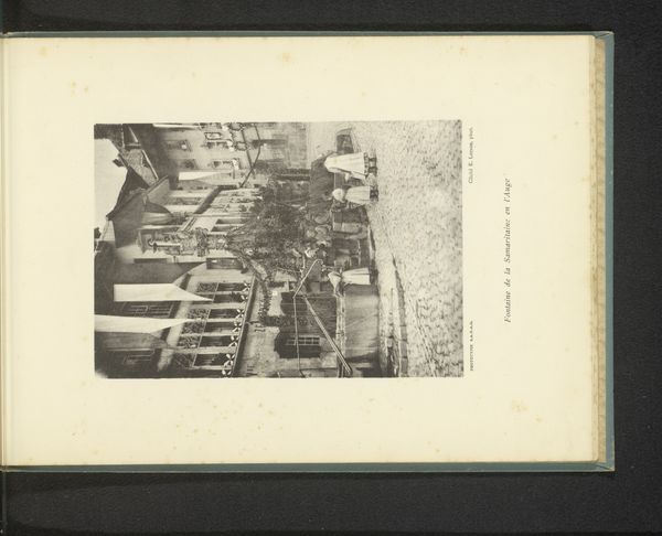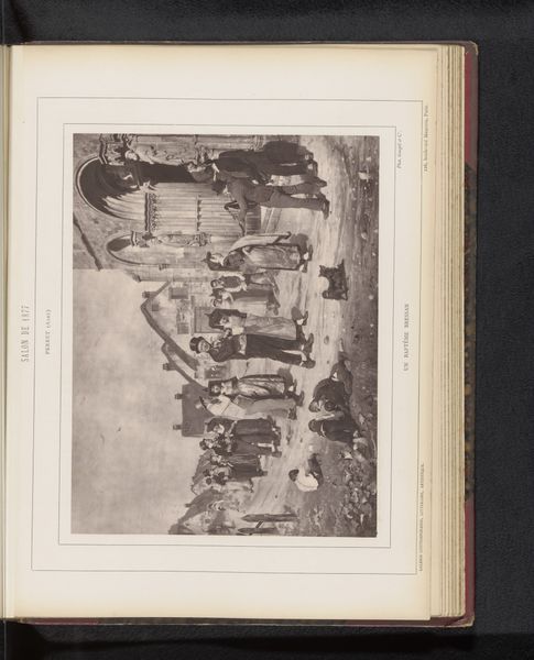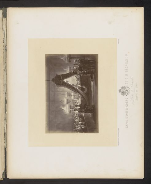 Curator: This photograph by Charles Bernhoeft, taken in 1894, depicts a group of men playing cards in what's labeled as the Tunisian section of the Antwerp World Fair. A striking image. Editor: My first impression is how effectively the photographer has captured a sense of casual yet ordered activity. The linear arrangement of the tables draws the eye, but the postures and garments break up that geometry, creating visual interest. Curator: It's intriguing to consider this through the lens of labor and presentation. World fairs were heavily implicated in showcasing colonial production. Consider what's included versus excluded in representing Tunisia to a Western audience. Editor: Precisely! The contrast of light and shadow in the arcade and clothing directs us to each detail: notice the arrangement of white clothing juxtaposed against the darkness of the building shadow. The figures pop against the geometry behind them. Curator: We see the performance of North African culture, carefully curated. Photography, especially at this time, played a huge role in shaping European perceptions of other parts of the world and helped secure Western power structures. This image would likely circulate back to the colonial administration. Editor: True. And while we cannot be entirely certain about Bernhoeft’s intention, we must also appreciate the internal structural harmony he was able to capture between foreground and background. These dark shapes on their lighter canvas is artful even considering its social intent. Curator: The photo offers insight into how these events not only represented colonized people but also offered a space for cultural exchange and interaction, albeit framed within a system of power imbalance. What were these materials they used for their game? Editor: Those are such insightful points. I agree this image's value is derived from understanding both composition and contextual making and display. It prompts a deep conversation on orientalism and representation in art and exhibition practices.