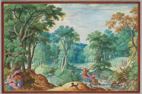 Editor: Right now, we’re looking at "Mountain Landscape with a Hunting Party in the Foreground" by F.C. van Bracht, painted in 1737. It's a delightful scene, so idyllic. The figures seem almost secondary to the sheer drama of the landscape. What strikes you when you look at it? Curator: Isn't it fascinating? The almost casual way Van Bracht juxtaposes the 'refinement' of the hunting party with the raw, untamed wilderness. It whispers to me about humanity's ongoing dialogue – or maybe a polite argument – with nature. I wonder, what are they hunting, really? Just game, or something more… elusive? What does it stir in you, beyond the idyllic scene? Editor: I think it makes me wonder what life would have been like in those times. Do you think there is a kind of symbolism going on, with the hunt and nature’s abundance contrasting with this feeling of human striving? Curator: Precisely! The hunting party itself is staged almost like a little play. Van Bracht stages it wonderfully: Look at that distant fortress! Does it loom, or does it simply watch? Does it hint at safety, or entrapment? Van Bracht's painting is a mirror, isn't it? Reflecting not just a landscape, but our own questions back at us. Editor: Yes, and there’s so much detail to absorb in the way the hunt is painted and in the natural world as well. Curator: True, but it's about finding the extraordinary within the everyday. The painting seems to invite us to question: where do we situate ourselves within the grand scheme? Are we masters, or merely guests? Editor: Well, this makes me feel like there's far more to it than just men in a landscape enjoying nature. Thanks for opening my eyes. Curator: And thank you, for keeping my mind and vision fresh. Art is never truly 'seen' alone, is it? It needs the echo of another's thoughts to truly resonate.