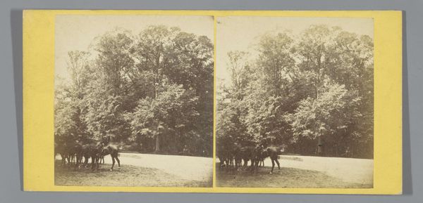 Curator: This striking gelatin silver print, entitled "Successful Hunters dressing Elk", was produced in 1876 by William I. Marshall. It’s quite a scene. What’s your initial response to it? Editor: It’s brutal, isn’t it? A tableau of colonial domination rendered in stark monochrome. The bodies of the elk strewn across the grass, a violent assertion of power. Curator: Yes, there’s a visual bluntness that’s hard to ignore. The fallen elk, for me, evoke vulnerability and the end of something, of course, but also the circle of life in these wilderness scenes. Consider the photographic printing process itself, rendering depth and contrast from light and shadow... Editor: It’s interesting you mention the contrast, as the sharp delineation feels purposeful, underscoring the separation between the 'civilized' hunters and the 'defeated' wild. Look how the two figures are framed, actively working amidst their kills, claiming their spoils. What sort of messages does this imagery project? Curator: Indeed, Marshall was keen to highlight the progress of man. The very act of documenting the scene through photography lends it an air of 'truth,' seemingly endorsing that message of conquest. It serves, in some way, to glorify the expansion and perceived control of the land. Editor: It is certainly part of that complex history of the West, marking both exploration and exploitation, as well as commodification through the making of ‘Yellowstone Views’ for the tourist market, advertised here. Who were the recipients and consumers of such depictions? Curator: This particular image evokes questions about cultural memory and shifting landscapes. What do we, as viewers now, project back onto such images? The slain Elk serve as powerful emblems, evoking wilderness but also ecological transformation. Editor: The act of preservation implicit in cataloging these “views” jars with the destructive nature of the hunt pictured. I think by interrogating such juxtapositions, we open necessary dialogues about conservation, representation, and accountability within historical contexts. Curator: Looking closer, the print resonates far beyond a mere historical record; its starkness reminds us of our intertwined roles in shaping, perceiving and judging. Editor: A single image, loaded with the heavy baggage of the past and urging crucial debates for our present and future.