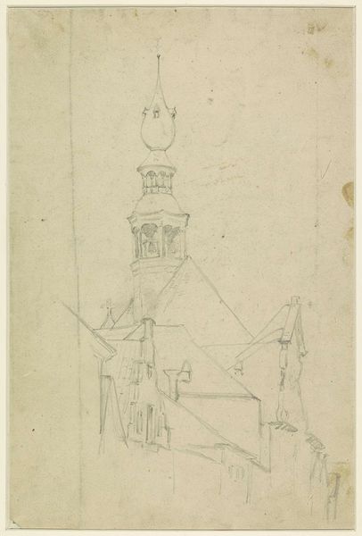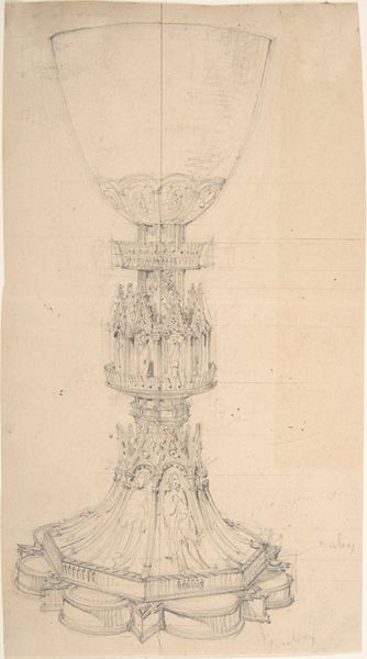 Isaac Gosschalk created this sketch, titled 'Kelk op een sokkel en een Romeinse torenspits', using delicate lines to depict architectural elements. The contrast between the ethereal chalice on a plinth and the intricate Roman spire immediately captures your attention, inviting you to examine the structural relationships at play. Look closely at how Gosschalk employs line quality to differentiate form. The chalice, rendered with lighter, almost hesitant strokes, suggests a fleeting, idealized form. In contrast, the spire is articulated with sharper, more deliberate lines. The visual weight creates a sense of stability and permanence. This contrast might reflect broader tensions of the 19th century: the tension between the spiritual and the structural, or the ideal and the real. The drawing prompts us to consider how the artist may have been thinking about how the cultural values embedded in architectural forms impact a viewer. Note how the cross atop the spire and the chalice are juxtaposed, prompting us to question meaning and representation.