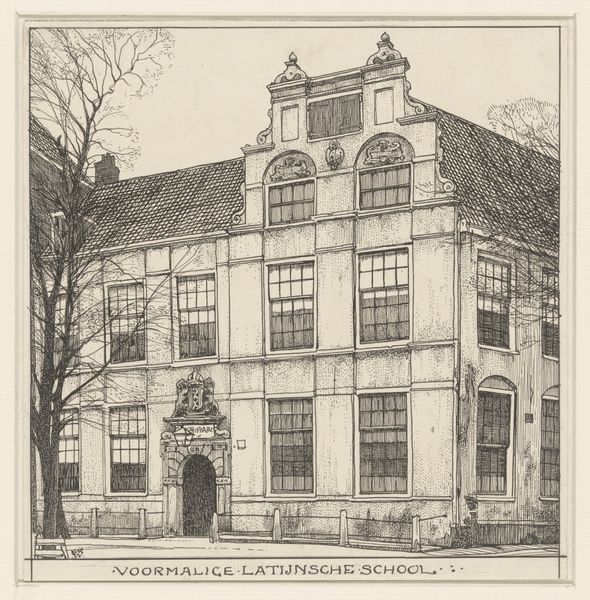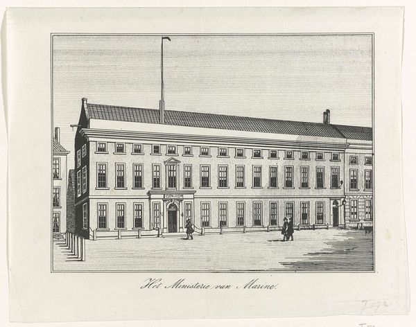 Editor: So, this is “Het nieuwe gebouw van de Kweekschool voor Zeevaart, te Amsterdam,” made sometime between 1874 and 1888. It's a print—an engraving, to be exact—showing the new Naval Training School in Amsterdam. I’m struck by how detailed the brickwork is, but it also feels very formal. What strikes you about it? Curator: I’m drawn to the processes involved in its creation and the statement the building itself makes about labour and industry. Look at the engraving technique—the labor involved in translating architecture into a reproducible image! Consider how that act, creating multiple copies, democratizes the consumption of this design. Editor: Democratizes? Curator: Exactly. The print medium allows wider access to this architectural vision. Who was meant to view this print? The students attending the school? Or potential investors? Understanding the intended audience reveals clues about the value of maritime education in Amsterdam at the time. What materials do you think were used in the actual building’s construction and how does the engraving convey that materiality? Editor: Well, looking at the engraving, I’d guess brick, maybe some sandstone for ornamentation? But seeing it in a print flattens it out, doesn't it? It's a representation of labor, not the actual labor of construction. Curator: That flattening is significant! The engraving transforms the physical labour of bricklaying into an image for contemplation and perhaps, for promoting further industrial advancement. It shifts the building’s meaning, separating it from its purely functional existence. Editor: I see your point. The print is like a form of marketing, reflecting the values associated with the school itself and projecting those values to the broader public. Curator: Precisely. And consider the consumption of these images – each print potentially furthering a particular vision of Dutch progress through naval power and technological advancement. It speaks volumes about material aspirations during that period. Editor: This has given me a totally new way to think about prints of architecture. It's not just documentation, but active participation in shaping perceptions about materials, labour and progress. Thanks!