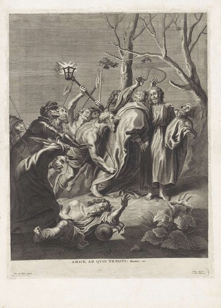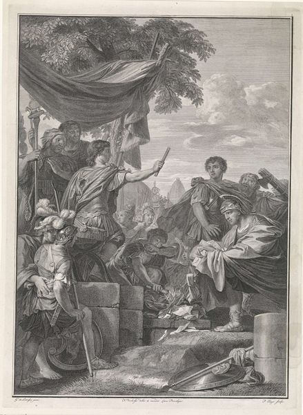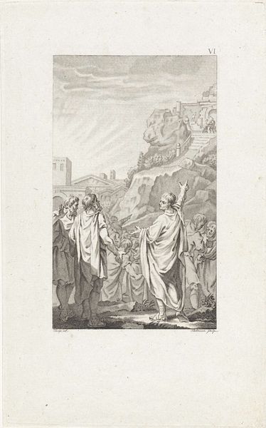 Editor: This is "Christus verschijnt bij het Meer van Galilea," or "Christ Appears at the Sea of Galilee," an engraving by Jacob Folkema, sometime between 1702 and 1767. The texture of the aged, toned paper really draws me in. It's interesting to think about its age and how that affects the image itself. What do you see when you look at this print? Curator: What immediately strikes me is the labour involved in producing such a detailed print. Consider the artist's process: the deliberate crafting of each line with a burin, the intense physical effort to transfer the image onto the copper plate, the successive inking and printing of each copy. It wasn't simply about replicating an image, but engaging in a craft rooted in tradition, skill, and accessibility via dissemination. Think about the social implications of reproducing the gospels in the homes of regular folk. Editor: That’s fascinating. So, you’re focusing on the physical act of creation and how that impacted the accessibility of religious imagery at the time? I hadn’t really considered that. Curator: Exactly. Furthermore, look at the consumption of the artwork. Consider where this print would have been displayed, in what context it would have been viewed. Was it for contemplation, decoration, or some other purpose that relates to a form of consumption? Editor: I suppose I've always thought about prints from this era as more like... reproductions. Now, hearing you talk about it makes me consider it as an accessible format that could impact faith as commodity, so to speak. Curator: Precisely. This print offers a tangible connection to religious narratives and also served as a point of distribution of that story in various classes. By engaging with materiality, we uncover a complex relationship between artistic creation, social context, and consumer culture. Editor: Thanks, that really opens up my understanding of the work beyond just the subject matter. Curator: Absolutely! Focusing on materials and the labor embedded within encourages us to analyze visual narratives as culturally contingent.