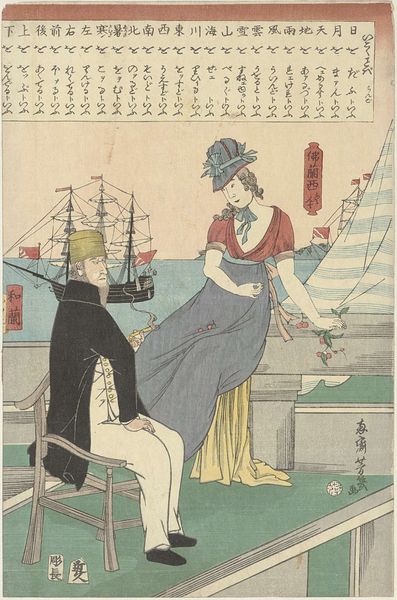 Editor: This is "Returning Sails at the Wharves" by Utagawa Yoshitora, a woodblock print from the series "Eight Views of Yokohama in BushÅ«." The blend of Japanese and Western attire is striking. What do you make of these cultural symbols? Curator: Notice the interplay of Japanese tradition and Western influence. The figures’ clothing, the ships, the very act of viewing the harbor – each carries the weight of a culture in transition. What memories and expectations might these images evoke in the viewer? Editor: I hadn't thought about it that way. It's like seeing two worlds colliding and coexisting simultaneously. Curator: Precisely. Visual symbols bridge the gap between the familiar and the foreign, revealing a shared human experience amidst cultural change.