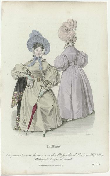 This print from July 1817 presents us with the "Morning & Evening Costume." The hats worn by these figures carry more than mere fashion; they are symbols of social identity and temporal demarcation. The large ribbons atop the hat of the standing figure evoke similar floral and vegetal motifs seen in Renaissance paintings, specifically Primavera by Botticelli, which symbolize fertility and the cyclical nature of life. This motif reappears in the elaborate feather headdress of the sitting figure, reminiscent of ancient headdresses worn in Egyptian royal ceremonies. Over time, feathers have been associated with the divine, with power, and with the ethereal. It also subtly hints at the expectations and roles ascribed to women, bound by the strictures of time and social appearance. In our collective memory, these adornments tap into deep-seated notions of status, beauty, and the performance of social roles, reflecting our perpetual dance between individuality and conformity.