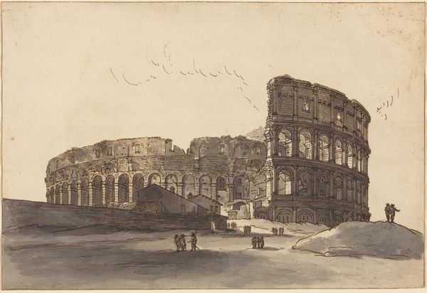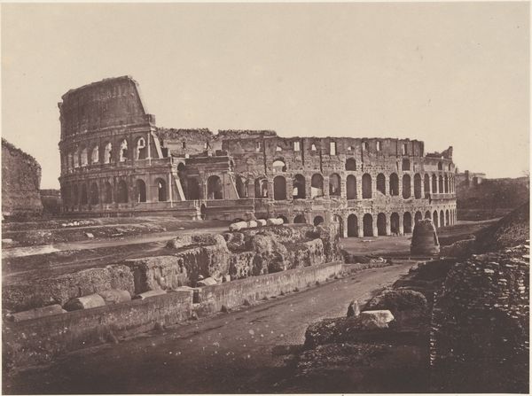 Editor: So, this photograph is titled "Coliseum," taken around 1867 by Robert MacPherson. It’s a silver print, and there’s something about the play of light and shadow that really draws me in. It almost feels like a stage set. What do you see when you look at it? Curator: Immediately, I observe the photographer’s careful manipulation of tonal values. The stark contrast between light and dark emphasizes the Coliseum’s architectural structure and decaying texture. Note the strong verticals, the framing of arches—the way the eye is led into the depths of the image by those repeated shapes. Editor: It’s interesting that you focus on the architecture. Did MacPherson intend to showcase it, or something else? Curator: One must analyze the composition itself. The artist, by deliberately choosing a frontal viewpoint, allows the monument to convey a sense of balance. And how the light sculpts form, almost breathing new life into the ruins. Consider, too, how he organized the buildings and the interior; the tonal gradations that give the photograph space and scale. Editor: I see what you mean about the formal elements working together. The geometric quality also helps to create perspective. The textures do emphasize a monumental ruin. But, doesn't that neglect a deeper reading? Curator: Does form not give rise to meaning? What could this photograph tell us about the medium itself? Editor: So, looking closely at how MacPherson captured and arranged everything provides the deeper meaning. I appreciate your viewpoint! Curator: Precisely. Every technical element works in concert, culminating in the viewer's aesthetic understanding of MacPherson's "Coliseum."
