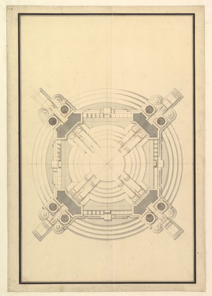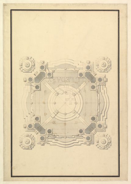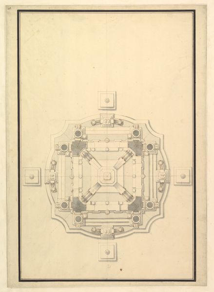 Editor: Here we have Giuseppe Galli Bibiena's "Ground Plan for a Catafalque for a Duke of Wolfenbüttel-Brunswich, probably Anton Ulrich (d. 1714)," created sometime between 1696 and 1756. It looks like a blueprint for an incredibly ornate mausoleum or stage set! What can you tell me about this drawing and the context surrounding its creation? Curator: This work highlights the spectacle inherent in Baroque art, where even death becomes a theatrical display. Consider the social and political function of elaborate funerals during this period. These catafalques weren’t just about mourning; they were potent demonstrations of power, status, and dynastic legitimacy. Think about the audience; who would have been invited to witness this grand display, and what message was intended for them? Editor: So it's not just a somber occasion, but also a political performance? It's interesting how architecture itself becomes a form of propaganda. Curator: Precisely. Bibiena, from a family of renowned stage designers, understood how to use visual drama to influence public perception. These catafalques often involved temporary architectural structures erected within churches or public spaces. Notice the geometric precision and intricate details. What effect do you think this level of detail would have on the viewer? Editor: I imagine it would inspire a sense of awe and perhaps even intimidate the viewer. It emphasizes the Duke's importance and wealth. The very planning of such an elaborate structure speaks volumes. Curator: Indeed. The commission of such a design, even if never fully realized, solidifies the Duke's legacy and the family’s continuing claim to power. How does this change your understanding of the role of art and architecture during the Baroque period? Editor: It makes me realize art isn't just about beauty, it's also deeply intertwined with power structures and social dynamics. Thanks! Curator: A keen observation! It shows how artists in the Baroque era served not just as creators, but as orchestrators of visual rhetoric within a complex socio-political landscape.