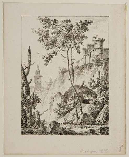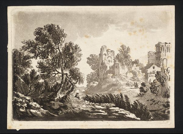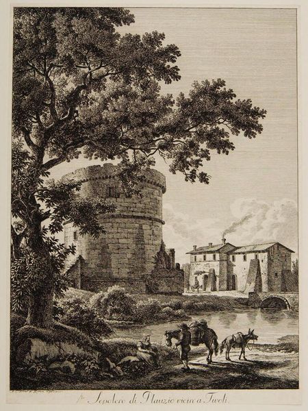 Curator: This print, "Tomb of Plautius Near Tivoli," by Albert Christoph Dies, presents a very picturesque Italian landscape. I'm immediately struck by the contrast between the sturdy, ancient architecture and the delicate rendering of the foliage. Editor: It evokes a sense of timelessness, doesn't it? The tomb, a powerful symbol of remembrance, stands against the backdrop of daily life, those figures with their laden donkeys. The tree in the foreground seems to guard the site. Curator: Dies captures the way ruins were romanticized at the time, reflecting cultural fascination with the past but also the power structures that allowed these scenes to be captured and circulated. Editor: And what do we make of that lone figure resting by the water? Are they a contemplative observer, drawing inspiration from the past, or merely seeking respite from their journey? Perhaps both. Curator: It’s interesting how Dies uses light and shadow to further emphasize a quiet solemnity, while acknowledging the everyday. Editor: Indeed, a visual reminder that even in the face of mortality, life continues.