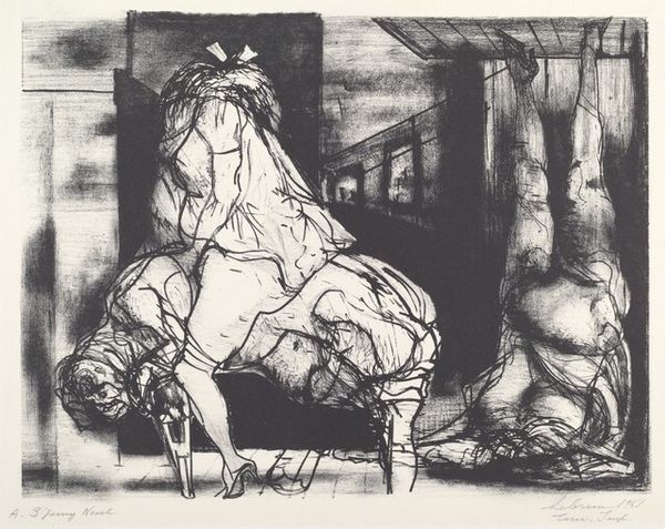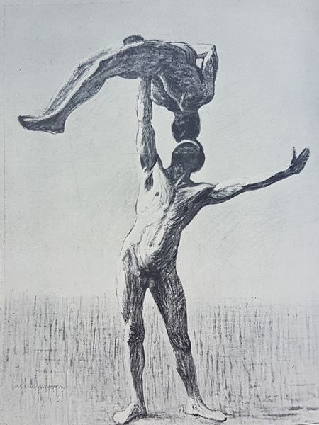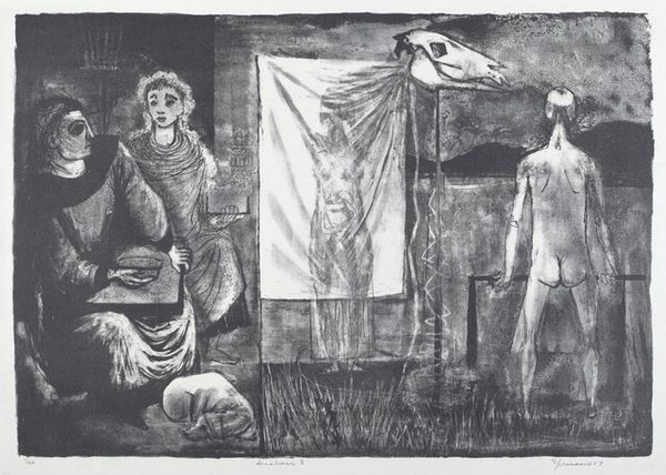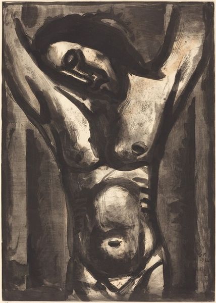 Editor: This is Rico Lebrun’s "Grunewald Study" from 1961, done with charcoal. The contorted figures are haunting. What historical dialogue is Lebrun engaging with here? Curator: I see a profound commentary on suffering and power, steeped in socio-political anxieties. Lebrun returns us to Matthias Grünewald's Isenheim Altarpiece, specifically its visceral depiction of Christ’s crucifixion. He translates it through a modern lens, echoing the trauma and devastation of the mid-20th century – the Holocaust, the looming threat of nuclear war. It becomes less about purely religious suffering and more about humanity's capacity for inflicting pain. What effect do you think the medium, charcoal, has on this message? Editor: The roughness and darkness of the charcoal definitely amplify the sense of brutality and despair. Curator: Precisely. It evokes the Black Arts Movement, aligning spiritual pain with social and racial struggle. Look at the figures – fragmented, distorted, mirroring a world torn apart. Consider how this piece relates to the broader themes of identity, race, and the ongoing legacies of violence in our world. Editor: It's interesting to consider how Lebrun transforms religious iconography into a broader statement about human suffering. He connects the historical and the contemporary. Curator: Absolutely, it prompts us to ask: How do we, as viewers in the 21st century, confront the pain and trauma represented in this work, and how can art catalyze empathy and social action? Editor: It is indeed powerful how historical artworks can hold such important relevance. I learned a lot.