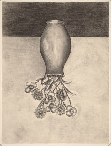 Curator: There’s something immediately somber about this work by Pamela Bianco. It feels almost like a memento mori, doesn’t it? Editor: We're looking at "Zinnias", a drawing and print created in 1927, executed with graphite in what looks like a meticulous, almost pointillist style. I'm struck by how much labor went into rendering such a commonplace subject matter. Curator: Exactly! And the use of zinnias – those sturdy, late-summer flowers – are steeped in symbolic meanings across cultures. They often signify remembrance or thoughts of absent friends. Here, set in this somewhat austere glass, their effect is further deepened, hinting at loss and reflection. It reminds one of funerary flower arrangements that embody cultural notions of death. Editor: But doesn’t that elevate what otherwise could be dismissed as a purely decorative domestic object? Bianco elevates craft to an art, in rendering such detail. We have these repeated tiny graphite marks creating this soft gray tone in the flower petals, and a range of optical effects, that suggests real three-dimensionality, but entirely constructed through manual processes. I am keen to contextualize this relative to gendered artistic labour and commodity culture. Curator: And the composition further strengthens the feeling; this is not a celebration of vibrant life, it's a portrait, a kind of solemn portrait in ink. Look how she meticulously defines the space in and outside of the glass, perhaps alluding to containment, constraint, and emotional or creative barriers. Editor: I see it in those pea pods – a surprising inclusion in a floral still life, they bring me to thoughts of garden harvests and manual agricultural work, too. Bianco also introduces a subtle disruption – they break out from typical representations of bourgeois consumption. The geometric border is almost a distraction; it fails to confine these floral and agricultural forms, almost attempting to mimic a manufactured edge in this hand rendered copy. It serves to challenge our perception of production methods. Curator: It’s a work that invites a second and a third look, not because of its grandeur, but because it softly resonates, inviting us to ponder transient nature, its beauty, and ultimate ephemerality. Editor: Yes, "Zinnias," through both material execution and visual elements, prompts an unexpected dialogue about the meanings of labor, value, and cultural associations with death during this interwar period.