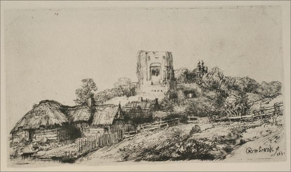 Curator: Looking at this etching by Willem Matthias Jan van Dielen, titled "Zuidelijk landschap met poort en toren op rots," made sometime between 1815 and 1867, I'm struck by the palpable sense of decay and time. Editor: Immediately, I'm noticing the stark contrast between the architectural elements and the untamed landscape, and I wonder how this speaks to broader social shifts and the romanticization of ruins during this period. Curator: Observe how the artist renders the crumbling facade of the tower. It's not just depiction; the lines themselves, created through etching, convey the fragmented and aged texture of the stone. This technique allows the form to almost dissolve into the scene, a conscious blurring. Editor: The method of production, being printmaking, surely had impacts. One must remember that etchings such as these facilitated a mass consumption of imagery—what effect might that have had on how such romantic ideals took hold in the first place, especially among a growing middle class? Was it simply an aristocratic nostalgia, or something more accessible? Curator: Perhaps accessible, though undeniably referencing older conventions. There's an intentional obscuring of clear forms. Rather than sharp lines, we get atmospheric depth through nuanced shades of grey and a diffusion of contours, contributing to the sublime, but troubled feel. Editor: What does this suggest about Van Dielen's studio practice? The plate production—its materials, tools, even the allocation of time—it all emphasizes an intentional craftsmanship. Was there, possibly, an overt romanticising of craft against what might have been viewed as the onset of soulless, industrial fabrication? Curator: It seems as if Van Dielen, in embracing realism within a landscape, points to a world irrevocably marked by time, decay, and change, inviting us to meditate on temporality itself. Editor: Ultimately, I am now looking beyond mere visual language; instead, it all reveals deeper historical narratives through a singular lens on a world moving away from agricultural modes, slowly shifting into newer technological production frameworks that, ironically, this particular piece gestures towards romanticizing the past.