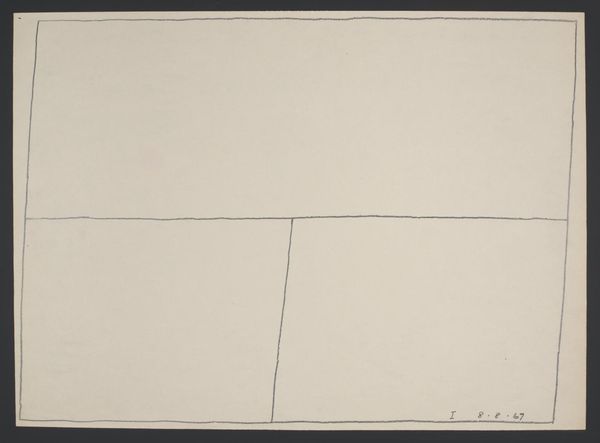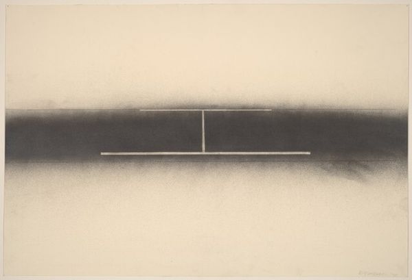 Curator: Right now we're looking at Karel Malich's "Graphic Sheet 4.V," an etching from 1967. What are your initial thoughts on it? Editor: Stark. Utterly stark. It feels like looking at a crack in the universe or maybe a graph representing the sound of silence. A line cutting through a field of grey... sort of lonely and yet precise. Curator: That sense of precision is key, I think. Malich was working within the Postminimalist movement. This turn toward very simple geometries reflects the art world’s turn against what was regarded as overly theatrical art in favor of more conceptual forms. Editor: Ah, the rebellion! It always simmers just below the surface, doesn't it? You can almost feel the artist muttering, "Enough with the grandiose gestures!" What about that small, almost imperceptible notch on the line itself? It's an anomaly. It is begging me for an explanation! Curator: Those small, irregular details are where the hand of the artist comes through—it disrupts the cool abstraction with a gesture of intentionality. If the pure straight line could embody relentless systematic reason, a detail like that represents lived experience or perhaps even, an opening for personal liberty within prescribed social spaces. Editor: That's it, lived experience disrupting order. Makes it feel more… human. I suppose I’m drawn to what those imperfections represent—the unplanned detour in an otherwise rigid plan, like a wrinkle on an emotionless face. Art making feels much more like a human necessity and an integral means of interrogating authority, doesn't it? Curator: I agree. Thinking about Czech art and culture under Soviet occupation makes one appreciate the subversive charge an apparently harmless aesthetic position might be assigned, often by a security apparatus which is anything but tolerant! Editor: In some ways, this almost mathematical work says so much with so little—leaving us to fill the emotional space that the composition hints at, which feels more generative than prescriptive in an otherwise prescribed society. A clever bit of escapism—visual code for survival. Curator: Exactly. Even these pared down abstract pieces like this can hold within them so much meaning. Editor: Art, an ever-unfolding mirror. Always offering another plane of thought.