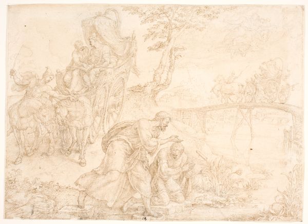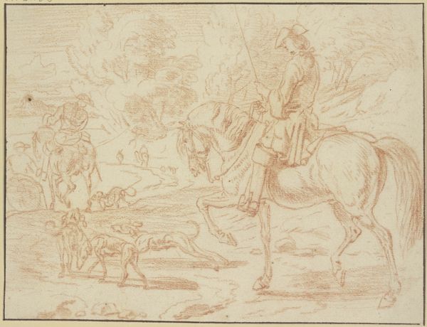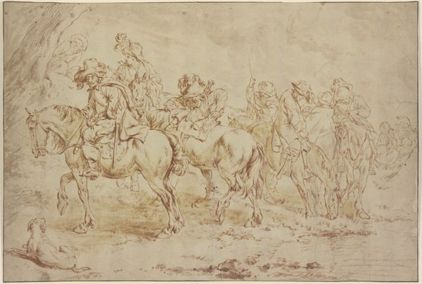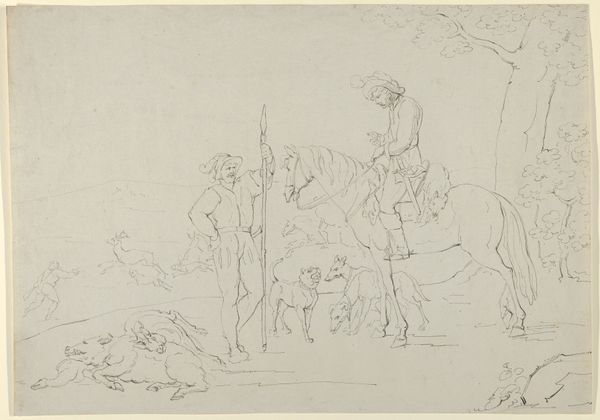 Curator: Here we have "Calvarymen Beside Tree," a pencil and graphite drawing on paper by John Frederick Tayler, date unknown, at the Art Institute of Chicago. Editor: Immediately striking is its airy, almost ghostly quality. The pale graphite lends a dreamlike impermanence, and the scene appears captured in fleeting, imprecise strokes. Curator: Yes, let's unpack that a bit. Tayler's landscapes frequently feature scenes of horsemanship, drawing upon conventions of military prowess and country leisure. Yet his portrayal avoids direct depictions of violence or hierarchy, focusing instead on moments of seeming tranquility. This is perhaps why that dreamlike feeling. Editor: There’s something undeniably classical, yet undone about it. Look at how the graphite is feathered, particularly to suggest mass of horse bodies. Almost suggestive, this is a gestural underpainting, revealing the skeletal forms underneath a polished exterior. But where’s the finality? The horses rendered like elegant yet fading memories of past military campaigns. Curator: Precisely, the academic treatment lends itself to a discourse surrounding how historical narratives often whitewash over lived experiences of conflict. Consider how the absence of distinct facial features—combined with a somewhat ambiguous background—broadens its applicability beyond singular figures and moments. We are prompted to reflect on a larger theme; those of the ordinary soldier, always present but rarely seen in our recorded histories. Editor: A valid point! I'm drawn, as well, to how the work challenges established artistic forms. The subdued tone minimizes hierarchical and confrontational narratives traditionally associated with calvary art. But maybe these very same 'omissions' or artistic strategies are the real reveal in how Tayler subtly, or not so subtly critiques structures and traditional historical representations. The lack of polish suggests a kind of resistance. Curator: Exactly, the deliberate sketch-like form creates an accessible entry point and demands interrogation by inviting the viewer to reflect upon what those conventional portrayals conceal or reinforce. Perhaps "Calvarymen Beside Tree", acts as more than just landscape or military art. Its strengths reside in questioning artistic and cultural forms simultaneously. Editor: So, it prompts us to engage, decode and discover new meanings of past artistic periods to broaden the social significance of art today! Fascinating. Curator: Absolutely, let's move on to the next piece.