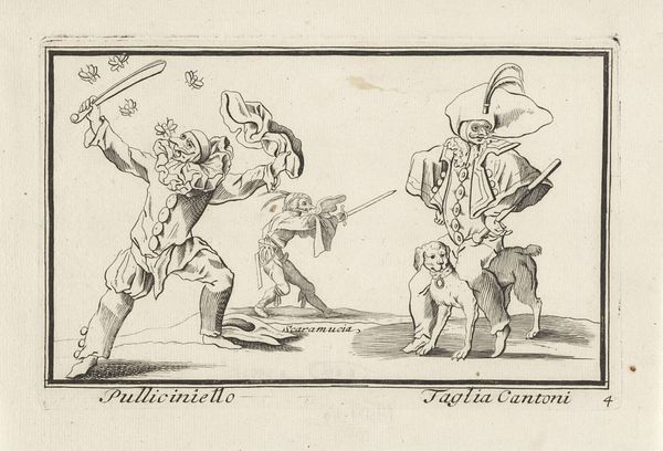 This line engraving by Anthonie de Winter presents three figures: Cucurucu, Cap. Bellavita, and Cap. Grillo. The composition is simple, with each character clearly delineated against a neutral ground, framed by a clean, dark border. The characters' exaggerated postures and features immediately capture attention. Look closely at the lines; they create a sense of dynamic movement, almost as if they are frozen mid-performance. De Winter plays with caricature, distorting proportions to amplify the comical nature of his subjects. The linear precision allows a semiotic reading of the characters. Note the plumed hats, swords, and ruffled collars - these are signs, symbolic elements suggesting roles of vanity, bravado, and perhaps folly. The arrangement of the figures, each in their distinct pose, reflects a structured approach to visual storytelling, inviting us to decode the narrative and the underlying social critique embedded within. This isn't just visual jest; it's a commentary on identity, performance, and the semiotics of self-presentation.
