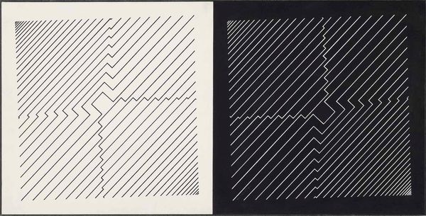 Curator: Here we have Mel Bochner's "Meditation on Theorem of Pythagoras," a print held in the Harvard Art Museums. Editor: Immediately striking is the stark contrast of the two panels, one light with numbers, the other dark with circles. A duality of representation perhaps? Curator: Indeed. Bochner, born in 1940, often used mathematical concepts to explore systems of thought and language. Note the grid format and the subtle shift in tone between the paper and the ink. It seems to explore how we give order to material. Editor: The theorem itself, a cornerstone of geometry, becomes a symbol of rational thought. Yet, the "meditation" suggests a deeper, more intuitive engagement. Curator: Precisely. It's about the process, the labor of translating an abstract idea into a tangible form, printed on paper, accessible for mass consumption. Editor: I see it as a visual koan. The numbers give way to form, the theorem to intuition. A journey towards understanding. Curator: Perhaps Bochner asks us to consider how knowledge is constructed through both abstract systems and material realities. Editor: It's a reminder that even within the most rigid structures, space exists for contemplation.