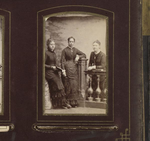 Curator: Here we have Johan Hendrik Hoffmeister’s “Portret van drie meisjes,” or “Portrait of Three Girls,” a gelatin silver print likely made between 1877 and 1883. It’s immediately striking, don't you think? The composition has such stillness to it. Editor: Stillness, and an odd sort of labor showing itself! Look at the way those girls are dressed. It’s fascinating to me how much detail has gone into the ruffles and folds. What were their lives like? Who made the dresses? All that intense detail sewn into heavy dark wool, likely by someone who saw none of the status afforded the wearers... Curator: Yes! It does invite questions. The materiality here feels particularly poignant. It speaks to an almost tangible weight of expectation, perhaps? The photo feels laden with unspoken stories. Their gazes hold so much… solemnity? Maybe that's the wrong word. It is an artfully staged scene, though—a studio photograph, designed to convey respectability. Editor: Designed to look respectable, absolutely! But respectability is *work*. Making and maintaining appearances. Those complicated dresses needed to be constantly repaired and cleaned by someone, and I bet it wasn't those children. It reminds us that images always have hidden labor costs. Also the gelatine, it was extracted through the work and violence enacted on animal bodies... Curator: The violence is always part of the picture, isn't it? Even in portraiture. Yet beyond the undercurrents of class and industry, the image also breathes a delicate innocence. You can feel it in the awkward postures of the girls, how they haven’t quite learned to pose. They seem like they are holding back laughter or conversation, so it makes you wonder who they really were behind the trappings. Editor: Behind those painful, itchy frills and buttoned-up sleeves! Thinking about those garments – the physical demands of creating something so elaborate… it is a testament to hidden histories, of exploited labor as well as the beginnings of accessible photographic methods. These gelatin-silver prints democratized image-making, sort of. Curator: Leaving an imprint nonetheless, across lives and history itself. That’s why even with the studio constraints, even with my initial thoughts of staged performance, there’s something genuine still. And the interplay—between representation, aspiration, and social force, so to speak—lingers long after viewing it. Editor: I agree. These quiet images are worth spending time with; a good antidote to the flood of instantly consumed images of today. There's a power in slowing down, contemplating the sheer effort, visible and invisible, that shaped them and which they continue to show us.