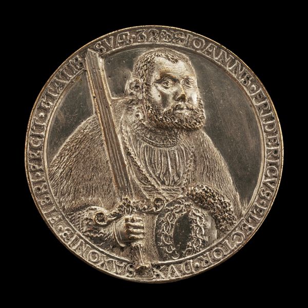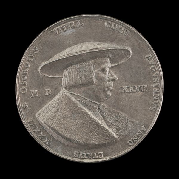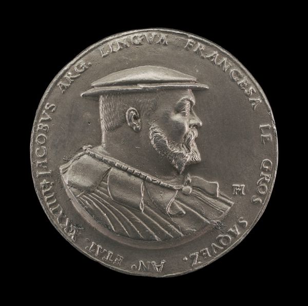Editor: This is a metal medal, titled "Georg Olinger, 1487-1557, Apothecary [obverse]", created in 1556 by Joachim Deschler. The texture and detail are impressive for such a small object! What significance did these kinds of portraits have during the Renaissance? Curator: These portrait medals gained popularity as ways of commemorating individuals, often those of status or accomplishment. In essence, it's an early form of public image-making. Editor: So, like a Renaissance headshot? How did portraying apothecaries fit into that culture of status? Curator: Exactly! By the mid-16th century, apothecaries were respected figures with significant civic roles. This medal elevates Olinger and broadcasts the social value of his profession. Look at the inscription – it likely details his titles or affiliations. This medal would have been displayed or exchanged among Olinger’s peers and those who wished to align themselves with him. Editor: Interesting! It really underscores how art isn't just "art," but also a form of communication deeply intertwined with social power. Curator: Precisely. It also gives you some insight into the developing self-awareness of the merchant class at that time. Olinger felt it necessary to have his image circulated publicly, beyond his circle of family and friends. Why do you think he wanted to do that? Editor: Maybe to solidify his legacy, or promote his business and social standing? It’s fascinating to consider how such an object can reveal the cultural values of the time. I never thought about how image-making was already strategic back then. Curator: Exactly! Seeing art as a form of social currency or capital allows us to see the past through a totally new lens.