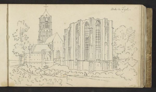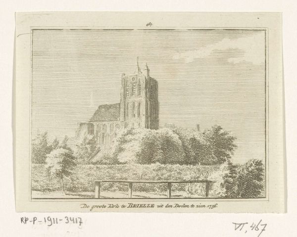 Curator: Looking at this drawing, "Gezicht op De Lier met Domtoren," created in 1731 by Abraham de Haen the Younger, one is immediately struck by the contrast of architectural elements and organic shapes of the surrounding landscape. Editor: Yes, a serene stillness pervades this pen and ink sketch. The towering Domtoren anchors the composition while the gentle foliage creates a soft border for the cityscape. Curator: It’s important to understand that images like this were made in response to burgeoning urban expansion and civic pride. The drawing captures not just the appearance, but the developing urban identity, emphasizing landmarks such as church towers as the town transforms. Editor: The texture achieved with the pen is remarkable; you can almost feel the handmade paper, the craftsman tracing the urban planning of the period! But looking beyond architectural history, it makes me wonder about the distribution and consumption of works on paper during the Dutch Golden Age. Curator: And consider the role of the Rijksmuseum as an institution in preserving and presenting pieces like this. The social context shapes what's valued. For example, did this piece celebrate faith, town identity, or even Dutch artistry and engineering? Editor: It certainly begs questions about patronage too. Was it commissioned, or made independently, sold as a singular item, or as part of a series? The labor involved in such a detailed pen work reminds us that art production of this quality was a luxury, reliant on societal resources. Curator: These kind of landscapes provide historical data of use to urban development too; you could trace population shifts through the sizes of the cities represented, comparing it to documents that recorded tax revenue. Editor: The piece also has implications regarding the use of labor as artistic labor, the distribution channels used, or even the culture from which such illustrations emerged and catered for the urban art market during that era. Curator: Precisely. Analyzing works such as this informs our understanding of socio-cultural shifts and the historical underpinnings of the art world as a system, in addition to Dutch city development in the 1700s. Editor: Exactly. A material examination reveals layers of socioeconomic narratives behind the artwork!