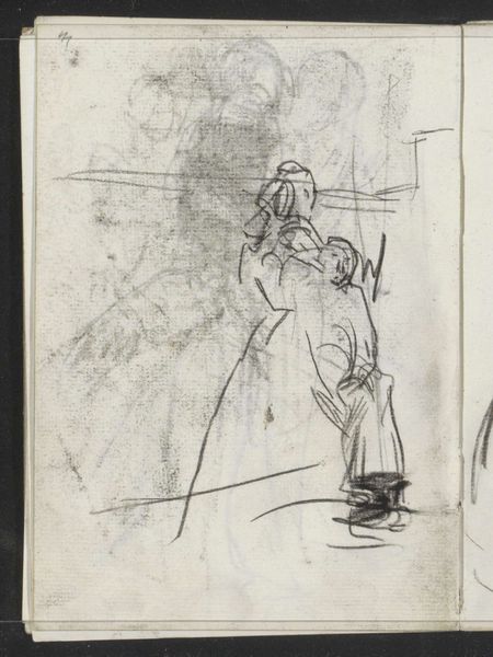 Curator: This is "Dirigent in een orkestbak," or "Conductor in an orchestra pit," a drawing by Isaac Israels, made sometime between 1930 and 1934. It's currently held here at the Rijksmuseum. Editor: Oh, I adore this! It's all nervous energy. Look at those scribbled lines – they give such a sense of frantic, creative movement. Like catching a fleeting thought before it vanishes. Curator: Exactly. The quick, impressionistic strokes really capture the conductor’s passion, and the tension in the moment. Notice the orchestra itself is barely there—suggested only by a few lines and the implication of instruments. It's all about the conductor's inner world, his…control and charisma over what is perceived. Editor: It's as if the musicians are almost an afterthought. He is completely lost in the music. Curator: And consider the symbolism inherent in the gesture itself. The upraised hands, the baton held aloft, it’s a universal symbol of authority, of creation, almost like a god calling forth order from chaos. A role usually reserved to patriarchal figures. Editor: Yes, and even the fact that it’s a sketch enhances that. It suggests that this isn't a definitive statement, but an exploration of power, maybe even a slightly ironic one. There is nothing overly assertive about his command. In that sense, it gives the conductor more agency. A self-empowerment process unfolding itself in each strike of the pencil. Curator: That ambiguity, that visual and symbolic dynamism, is key to understanding its lasting appeal. Its a study that lets us glimpse a private creative moment, almost intrusive in nature, by an artists depicting another artist working in flow. Editor: It’s wonderful. I keep coming back to those lines, that simple energy. They just vibrate off the page! So visceral and direct...you feel you are next to the composer at a live performance! Curator: I find it really quite remarkable how such a simple sketch can still convey such a strong sense of the artist, in his true form, capturing another artist. It’s almost a cultural document. Editor: Beautifully put. It reminds us of the electric potential simmering beneath the surface of any act of creation. It is such a rare intimate experience captured with simple strokes.
