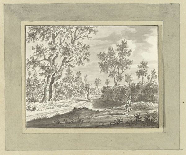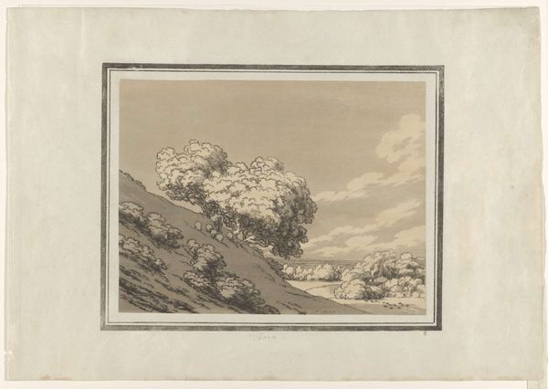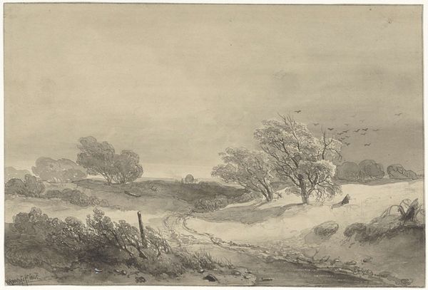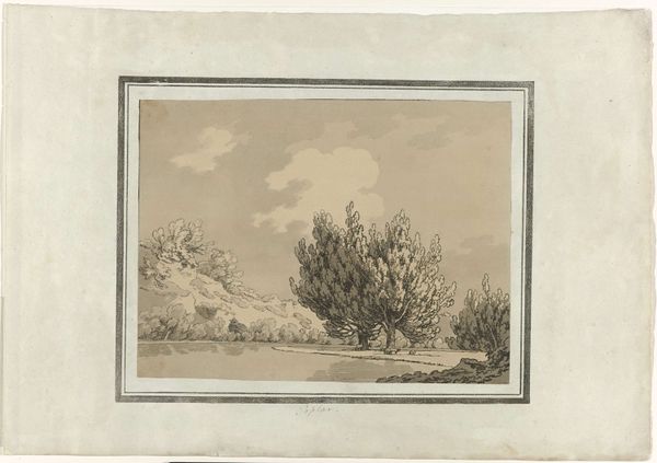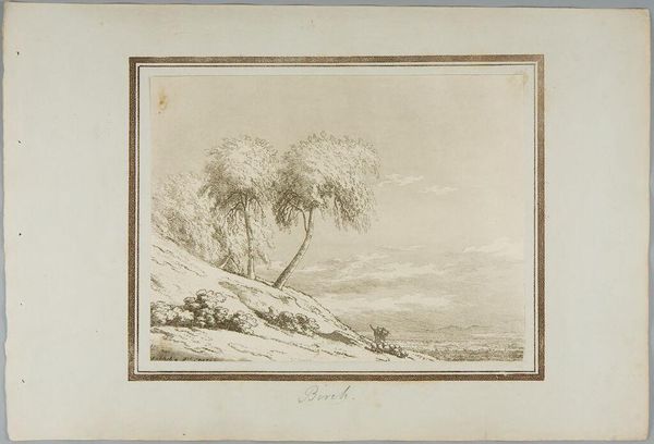 John Robert Cozens created "Birch" with pen and grey ink and grey wash, during a period in the late 18th century when artists explored the sublime power and beauty of nature. Cozens, working in the Romantic tradition, was particularly drawn to landscape. Here, we see a vision of nature that is both idealized and personal. The birch trees, rendered with delicate detail, stand on a hillside overlooking a distant view, with two figures. The use of monochrome tones creates a sense of tranquility, yet there’s also a hint of melancholy, a common theme in Romantic art. Cozens was working during a time of social and political upheaval, and many artists turned to nature as a source of solace and inspiration. Cozens’ personal struggles with mental health may have influenced his art. The solitary figures within the landscape invite introspection and a sense of being both a part of and apart from the world. In its quiet way, the drawing captures the complex relationship between the individual, nature, and society, reflecting the emotional and intellectual currents of its time.