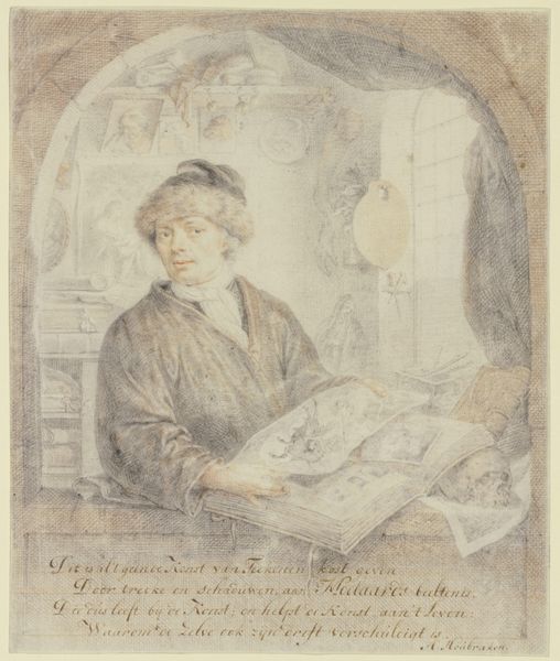 Nicolaas Verkolje’s “Portret van Jacob Moelaert” offers a glimpse into the life of an artist, created using an etching technique. Here we have a scene steeped in the visual language of the Dutch Golden Age, where self-awareness and the representation of one's trade became quite popular. Verkolje situates Moelaert in his workspace, surrounded by the tools and symbols of his artistic identity. The open book, displaying various sketches, acts as a window into Moelaert’s mind, revealing his inspirations. However, the presence of the skull, a memento mori, introduces a contrasting theme, reminding us of the transience of life, even amidst artistic creation. This blend of professional identity and existential contemplation encapsulates the complex dialogue artists had with their self-image and mortality. It asks us to consider how we, too, balance our public roles with our awareness of life's fleeting nature.