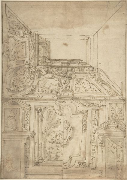 Curator: Well, what do you make of this delicate drawing, Leonardo Marini's "Design for One-Quarter of a Ceiling Decoration"? It was created sometime between 1730 and 1797 and rendered in ink on paper using etching and other printmaking techniques. Editor: My immediate impression is of airy elegance. The lightness of the etching combined with the flowing Rococo lines feels optimistic, even celebratory. Curator: Indeed! The Rococo style was a deliberate move away from the more rigid formality of the Baroque. This design reflects that societal shift towards lighter, more intimate spaces. The patronage system was changing, and art was finding new homes beyond the church and state. Editor: Absolutely. The cherubs flanking the central urn strike me. They’re not the powerful angels of religious iconography, but gentler spirits presiding over a domestic sphere. Curator: Precisely! They reflect a changing concept of authority, softer and more secular. Look closely, and you’ll see repeating motifs like wave patterns and stylized foliage. These patterns helped to establish a symbolic visual vocabulary. Editor: It feels like a very intentional effort to cultivate associations with wealth and luxury for those spaces. The geometric details work as symbolic language—almost coded status markers that viewers could readily recognize. It brings out the purpose of the drawing to show power in architectural design, literally ‘raising the roof’ to display prestige. Curator: Exactly. Remember that Marini was working within a culture where art served not just an aesthetic, but a clear social purpose. This ceiling wasn’t merely beautiful; it broadcast a particular message. The use of classical motifs, though softened by Rococo flourishes, consciously alluded to the grandeur of past empires. Editor: It's fascinating to think about how this one corner would've fit into the larger space. There’s also a sense of creative hope that lingers, a desire to make our spaces into stages where we perform the art of living, in splendor. Curator: It makes you realize that even what appears to be decorative, holds symbolic importance when you investigate cultural meaning and artistic purpose. Editor: It has certainly opened my eyes to how carefully curated and controlled these visual spaces would have been in shaping identity and reinforcing hierarchies!