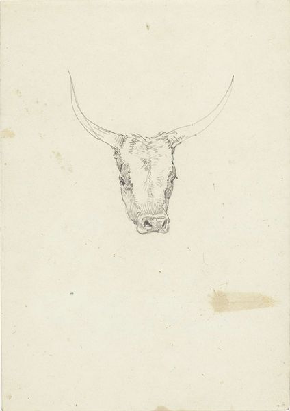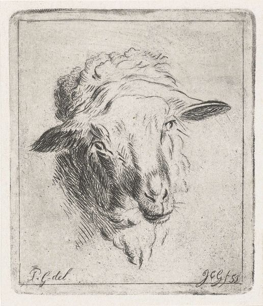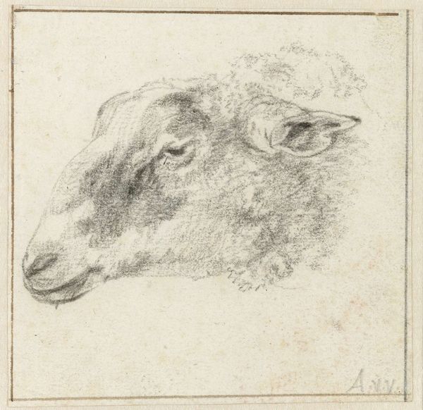Editor: Here we have Adriaen van de Velde’s “Schapenkop, van voren,” or “Sheep’s Head, from the Front,” dating from the mid-17th century. It's a drawing using graphite and charcoal. It’s remarkable how such simple materials create a drawing that feels so… intimate, almost melancholic. What do you see in this piece? Curator: Oh, it bleats to me of simpler times, literally! Van de Velde's sketch feels less like a study and more like a personality portrait, doesn't it? He’s capturing a specific… sheep-iness. Have you ever watched a sheep just… chew? There's a quiet dignity, a certain Zen to it. I bet he captured it between paintings of landscapes with figures or hunting scenes. What do you think he’s exploring here? Editor: I think the sheep has depth! The slight asymmetry makes it seem like an individual rather than just a generic farm animal. What makes this more than just an animal study? Curator: Ah, the artist's touch, the invisible hand bestowing individuality! This sheep becomes a muse, its simple presence radiating a profound beauty. Consider that a painter like Van de Velde, known for idyllic landscapes, finds himself captivated by… sheep. Is this pastoral affection? Is it a comment about the role of animals, beings on earth, like us? Or maybe he was just bored. Editor: That’s definitely something to ponder! It's amazing how much character can be conveyed with so few lines. Curator: Isn’t it? The everyday elevated. That, my dear, is the artist’s eternal quest, turning straw into spun gold, or in this case, sheep into… well, compelling art! Thanks, Adriaen, and thanks, contemplative sheep.