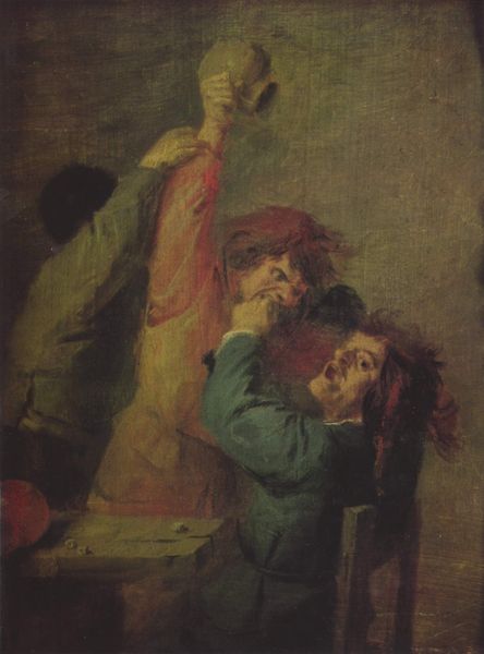 Adriaen Brouwer’s ‘The Brawl,’ is rendered in oil on wood panel with dimensions of 9 5/8 x 7 1/2 inches, plunging us into a tavern scene charged with raw emotion. The composition pivots around a dynamic tussle between two figures, their gestures captured mid-action, all set against a muted palette. Brouwer masterfully uses light and shadow to amplify the scene’s drama; the stark contrast highlights the men's faces and contorted bodies. The composition is structured to draw your eye through the chaos—from the upturned jug to the struggling faces. The surface texture, thick with brushstrokes, adds to the painting's visceral impact, reflecting the disordered passions on display. Brouwer challenges the formal decorum often found in genre painting. This work destabilizes established conventions by presenting a scene of unvarnished reality. It delves into the darker aspects of human behavior. The brawl does not merely depict a fight; it serves as a mirror, reflecting the volatile elements of society and the human condition itself.