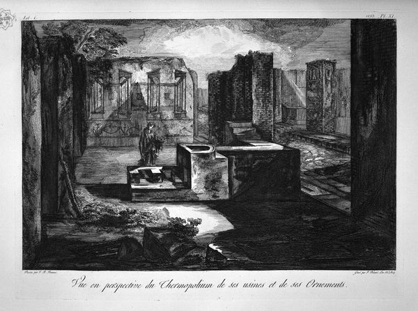 Giovanni Battista Piranesi created this print of a Thermopolium using etching, a printmaking technique that relies on acid to corrode lines into a metal plate. The deep blacks and subtle grays come from the careful control of this process, and the application of ink. What I find fascinating here is how Piranesi uses a relatively mechanical reproductive medium to convey a scene of classical ruin. The print can be endlessly multiplied, much like the remnants of Pompeii were available for viewing and consumption by wealthy Europeans on the Grand Tour. The subject and method are closely linked. Piranesi wasn't just documenting the past, he was packaging it for a modern audience, offering them a piece of history, mass-produced and mediated through his own artistic vision. The texture of the etching, with its gritty lines, subtly echoes the rough, broken surfaces of the ancient stones. It’s a ghost in the machine.