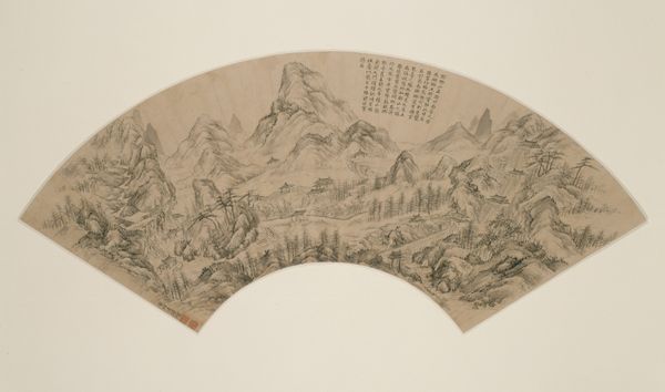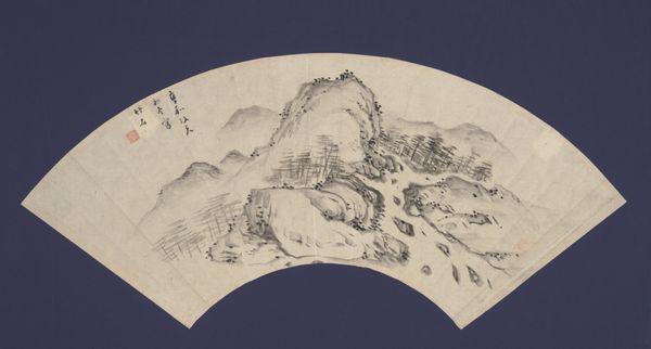 Toki Tōbun created this ink on paper Snowy Landscape, mounted as a fan, during the Muromachi period. The semicircular composition immediately draws the eye across the detailed brushstrokes, which define the rugged landscape. Notice the texture—how the ink pools and spreads, creating depth and contrast. The artist uses a limited palette, relying on monochrome ink to convey the chill of a winter scene. Structurally, the painting operates on several levels. The fan's shape itself is a cultural signifier, suggesting elegance and refinement. The landscape is not merely representational but embodies philosophical ideas of harmony and balance. The artist’s meticulous rendering reflects a deep engagement with Zen aesthetics, where simplicity and meditation are paramount. Consider how the painting invites us to contemplate the relationship between the self and the natural world. The deliberate brushwork and composition guide our gaze, reflecting an understanding of the artwork's role in shaping perception.