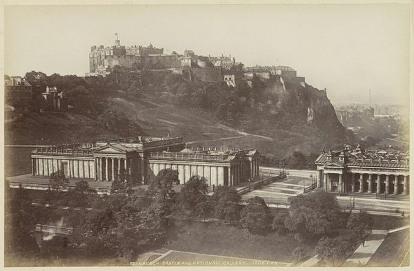 Editor: This gelatin silver print from between 1856 and 1863, taken by Juan Laurent, offers a stunning vista of the Alcázar of Segovia and its cathedral. The cityscape, shrouded in sepia tones, almost feels like a memory. How do you interpret this scene? Curator: I see a layered narrative deeply rooted in Spanish history and cultural identity. The Alcázar, a symbol of royal power, juxtaposed with the cathedral, representing spiritual authority, tells a story of shifting hegemonies and cultural syncretism. Notice how the photographer chose the viewpoint from Alameda de la Fuencisla, creating a sense of depth and revealing the stratification of society. Do you notice any particular symbols that resonate? Editor: Well, the strong verticality of both buildings really strikes me. They seem to reach towards the sky, which maybe suggests a reaching for higher ideals or...dominance? Curator: Precisely. Consider the symbolism inherent in architectural choices. The cathedral, predominantly Gothic in style, with its pointed arches, speaks of aspiration, while the Alcázar, borrowing from Romanesque traditions, with its robust, defensive structures, hints at power and security. This interplay also embodies the ongoing tension between faith and earthly power. The image freezes a transient moment in history. Do you think there's a sense of cultural memory embedded here? Editor: Absolutely! It’s like Laurent captured more than just a view; he's preserved a visual record of cultural evolution. Curator: Indeed, through the choice of subject matter and the soft focus characteristic of Pictorialism, Laurent invites us to contemplate how monuments shape our collective memory and inform our understanding of identity. Editor: I hadn't considered the composition that deeply before. This piece makes you think about how symbols, architecture and setting create something profound. Curator: Absolutely, it reveals how photographers also use their medium to delve into the cultural psychology of a place and time.