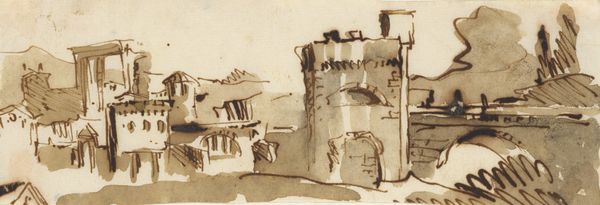 Curator: What a delightfully airy watercolor. It almost evaporates off the page. Editor: That's Hercules Brabazon Brabazon's "Koutoubia Mosque, Marrakech." Brabazon was deeply influenced by Turner, so we can appreciate the techniques of English landscape painting mingling with the subject of Orientalism. Curator: The minaret certainly commands attention. It ascends with a quiet, dignified presence, and the shadows cast are remarkably delicate. One almost feels the call to prayer just by gazing at it. Is the Koutoubia Mosque of particular significance? Editor: Absolutely. As one of the largest mosques in Marrakech, its minaret has become an iconic symbol, inspiring other structures such as the Hassan Tower in Rabat. This painting is as much about a sense of place as it is about aesthetic impressions. Brabazon was presenting his Western audience with an alluring view of a distant culture, part of the late 19th-century fascination with the Orient. Curator: So it's tapping into that current of exoticism that was so popular in the era. Are there specific symbols that connect to broader cultural associations of the Mosque? Editor: Consider the color palette—those muted tones evoke a feeling of ancient history, of enduring faith, of sun-baked earth, all aligning with how Europeans imagined North Africa. The very fact it's rendered in watercolor speaks volumes. Watercolor was seen as the ideal medium to capture fleeting moments, conveying the "authenticity" of lived experiences abroad. It subtly reinforces a Western gaze on this foreign landscape. Curator: It’s interesting how medium becomes message in this case. There’s such a casual feel about it, that it gives a perception of direct visual encounter by the painter. I’m not so sure that it gives any authentic feeling other than what Brabazon felt when he saw this impressive architecture. Editor: Perhaps the charm lies in the convergence. We have Brabazon interpreting Moroccan identity via an established Western artistic approach and an undeniably imposing sacred structure at its heart. It opens up rich conversations about power, representation, and artistic vision. Curator: Yes, seeing it like that helps one to understand what a seemingly simple painting reveals to its public and culture. Editor: Agreed. And that interplay is worth our reflection.
