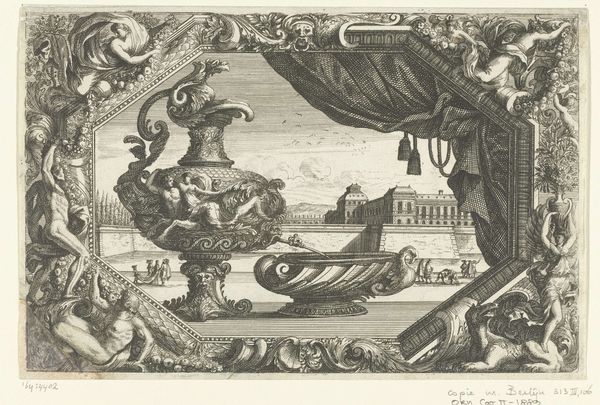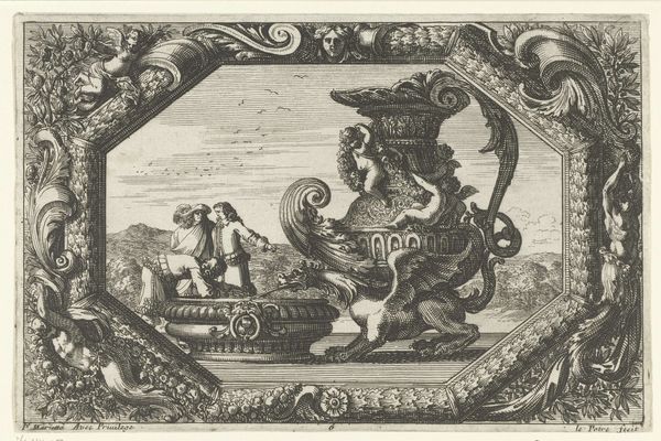 Curator: Right, so we’re looking at "Double-Headed Eagle", a print dating back to 1715 by Bernard Picart, currently held here at the Rijksmuseum. First thoughts? Editor: My first thought is, dramatic! There's a real weight, a severity in the hatching that creates a lot of shadow and tension in this little scene. Curator: Indeed. Picart was a master of etching and engraving. The intricacy he achieves is just incredible when you consider the tools and the size of the original plate. And look at that framing! It really encloses the central image, which depicts the eagle against this serene landscape. Editor: Precisely, and I see so much embedded symbolism. The double-headed eagle itself is a powerful symbol representing empires, perhaps a commentary on dual power structures, then and even now, in modern governance, maybe. It seems to bear a shield, almost reluctantly. Curator: Good observation! The eagle was a symbol of the Holy Roman Empire, so that reading absolutely aligns with historical context. And the motto above – "NEC TERTI RECVSABREM PONDVS" – it seems to speak to carrying the weight of responsibility. A potent image for its time. Editor: Yes, and thinking about the context… early 18th century, the echoes of grand dynastic ambitions were everywhere, empires were clashing. How do you see the role of allegory in his larger body of work, do you find he's typically critical or more celebratory of institutions and established authority? Curator: That’s a complex question! He often employed allegory to critique power but also sometimes to offer reverence. In the case of this engraving, my read is Picart is more critical because of that loaded imagery combined with the overall stern mood of the piece. It’s definitely asking more questions than offering answers, wouldn’t you agree? Editor: Absolutely. There’s a push-and-pull quality here. Even the foliage that frames the central image feels almost like constraints. It points towards imprisonment, maybe a commentary on the burdens of leadership. It leaves me considering those burdens now, too. It is a burden or an honor or maybe a bit of both? What are the implications for those ruled by such figures? It creates interesting critical tensions that still have resonance today, I think. Curator: I couldn't have said it better myself. Picart, through his intricate artistry and symbolic language, invites us to contemplate the very nature of power and responsibility and the inevitable weight that comes with it. Editor: A tiny artwork that leaves us contemplating the weight of centuries! I love that.