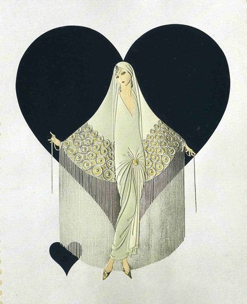 Curator: Here we have an elegant graphic work titled "Cirse," attributed to Erté. It's a wonderful example of Art Deco illustration and its embrace of linear grace. What strikes you immediately? Editor: The striking symmetry! Everything is meticulously balanced along a central vertical axis. The color palette is limited—mostly golds, browns, and grays—which enhances the figure's ethereal, otherworldly quality. Curator: Indeed. Erté often draws upon historical archetypes and motifs. The figure seems almost like a priestess, adorned in ritualistic attire. The halo-like structure above her head, formed from circles, has connotations with divinity, while the drapery flowing from it evokes both adornment and power. She reminds me of the art of ancient priestess figures in Babylonian times. Editor: Absolutely, the repetition of the circle is intriguing and it carries semiotic significance. Circles traditionally represent wholeness, cycles, and eternity. Here, repeated in the headdress, and echoing down the decorative panels in her clothing, they establish a system, a kind of visual alphabet or language in and of themselves. The whole figure is enframed. Curator: She does look as though she's placed within a proscenium, setting the stage for ritual and ceremony. You see elements that blend geometry with the organic to form this figure and her presentation as powerful and alluring. And if you look carefully at the details embellishing her clothes, they seem to hint at eyes, adding a level of scrutiny or watching to the scene. Editor: I see those details now. The 'eyes' within circles give it a panoptical element, a gaze of watchful presence which creates a subtle but significant tension. A very simple color palette with sophisticated linear design to communicate layers of concepts and contexts. Curator: Erté’s illustrations served as cultural reflections of a shifting era, one in which female archetypes were becoming increasingly important. The enduring appeal is the work’s combination of surface-level glamour and potent iconography. Editor: It offers a wonderful reminder of the Art Deco era's emphasis on aestheticism and also an enduring exploration into form as language.