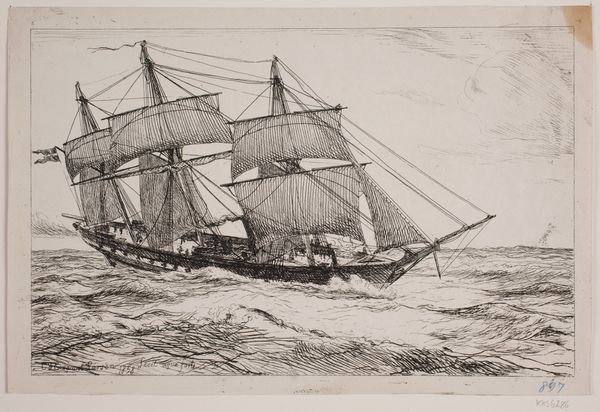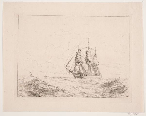 Editor: Anton Melbye's "Et fregatskib under den norske kyst," from 1851; it's an etching, creating a scene of dramatic seas. I’m struck by how turbulent and chaotic the ocean appears; almost as if the ship is at the mercy of nature's fury. What do you make of this work? Curator: You know, it’s fascinating, isn't it? Etchings, especially during the Romantic period, weren't just about replicating reality. They were often charged with emotion, reflecting a fascination with the sublime power of nature. I see a dance between human ambition—that frigate, a symbol of maritime power—and the humbling force of the sea. Melbye doesn't just show us a ship; he’s inviting us to contemplate our place in the face of nature's grand drama. Do you feel that tension when you look at it? Editor: I do. It feels like the ship is bravely battling against the elements. Is there something specifically Norwegian about it, beyond just the title? Curator: That's an insightful question. While the drama of the sea is universal, depicting the Norwegian coast certainly grounds the image in a particular cultural context. Consider how Norway's history is intertwined with the sea – exploration, fishing, naval power. The rough seas around the Norwegian coast were no joke, the livelihoods and lives were constantly tested. To me this encapsulates a collective understanding of a relationship with nature; more a wrestling match than a pleasant stroll. Editor: I hadn't thought about the cultural weight of the location. Curator: See, now I want to sail that coast. Or at least read a good saga by the fire, and leave the sailing to braver souls. Editor: It certainly paints a vivid picture. It’s been really interesting to consider this piece beyond just its surface. I'll never look at seascapes the same way. Curator: And for me, this conversation reignited my love for the sheer evocative power of black and white; Melbye speaks volumes in monochrome.