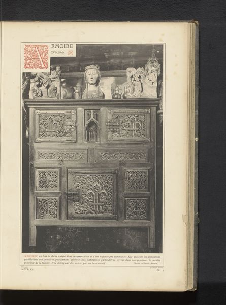 Editor: This is a photograph of the Reliquary Shrine of Saint Servatius in the Basilica of Saint Servatius in Maastricht, taken sometime before 1887. It seems to be a print with a photograph adhered to it. What strikes me most is the density of detail – every surface seems covered in intricate relief work. What are your initial thoughts on this piece? Curator: Indeed. Focus upon the deployment of visual elements: relief sculpture, specifically, governs our apprehension. The work exhibits a preoccupation with hierarchal organization, segmented by rigorous vertical and horizontal lines. Observe how each distinct panel is densely populated with figures rendered in a somewhat flattened, stylized manner, indicative of a pre-Renaissance aesthetic sensibility. The consistent depth across panels demands investigation into the conceptual rather than strictly representational properties of this object. What is emphasized through form? Editor: It seems to be emphasizing the divine through complex symbolic arrangements. The formal divisions create smaller narratives, and it's hard to tell what these mean. The verticality and density seem like a visual manifestation of faith. Would you agree? Curator: Precisely. Semiotically, the consistent application of depth signals importance. Absence of depth removes individual autonomy; they serve a divine goal in faith and life. Further, the photograph's monochromatic nature encourages emphasis upon the materiality and texture, calling for appreciation for sculptural volume independent of color. The object demands viewers analyze how light interacts with these forms, casting complex shadows that further enhance visual drama. Editor: That's fascinating. The emphasis on form over colour does change how I view the details. Instead of trying to decode everything immediately, I can appreciate the craft and organization itself. Curator: Form directs us to consider function. One must carefully study all attributes—the distribution of symbolic visual vocabulary across this work and how this object communicates both intention and faith. Editor: Thank you. Thinking about it that way makes the image both less chaotic and far richer in terms of the artist's decision-making.