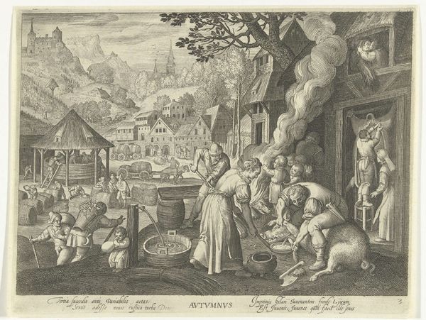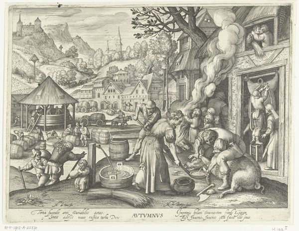 Claes Jansz. Visscher created this print around 1600, depicting the hemp industry and a rope factory. Made with the relatively common method of etching, the image provides an interesting window into a world of manual labor. We see a whole cycle of production here, with figures engaged in every stage of transforming raw hemp into rope. On the left, a woman spins hemp fibers into yarn, while workers beat the raw material, softening it. A horse-drawn device stretches the fibers, before they are twisted together to form strong ropes. Note how the artist shows the cooperative effort required for this process. The print also speaks to the social context of the time, highlighting the importance of rope-making as a key industry in the Dutch Republic. Rope was crucial for shipping, construction, and countless other applications. By focusing on the labor-intensive processes, Visscher reminds us of the reliance on manual skill and human effort. He elevates these activities to a worthy subject of art.