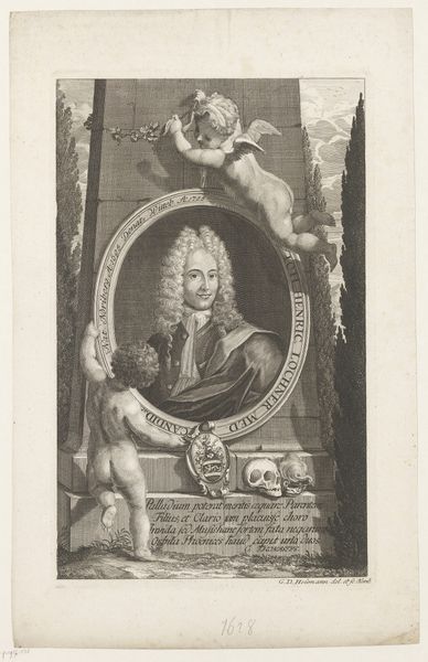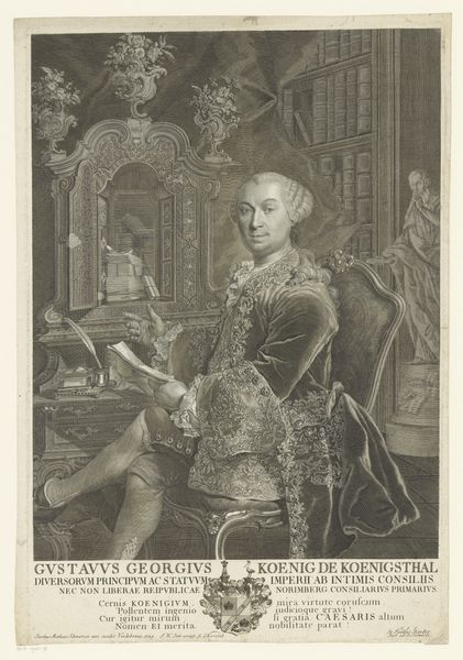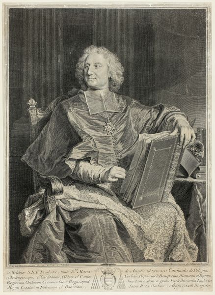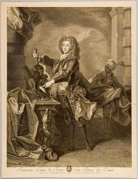 Curator: Before us, we have the "Portrait of François Louis de Bourbon, Prince de Conti," a 1700 engraving by Pierre Drevet currently housed in the Rijksmuseum. Editor: It’s strikingly formal, even theatrical. The billowing drapery, the armor, that almost unnerving steadiness in his gaze… It projects power, certainly, but also something almost brittle. Curator: Absolutely. The image is a masterclass in Baroque portraiture meant to convey status. Here, Drevet navigates the visual language of power, prestige, and legitimacy during a key point in European history. Conti was a member of the French royal house and his image needed to underscore that authority. Editor: I see such layered symbolism. The armor speaks of military prowess and protection, yet his hand delicately grasps a baton – almost like a scepter – more a sign of command than active warfare. Curator: Precisely. Note also the positioning of the Black page. These figures in the backgrounds of European art served less as individual portrayals, but more to amplify the main subject’s status through subjugated service. Its place within the wider political narrative is complicated and discomforting to modern eyes. Editor: Yes, there’s that tension again, isn’t there? These symbols of dominion are visually compelling yet undeniably unsettling, triggering layers of questions about cultural attitudes, exploitation, and historical context. I wonder what future generations will make of it all. Curator: It's that complexity, that uncomfortable collision of aesthetics and historical reality, that makes this a vital artwork. These historical artifacts are documents that deserve continued analysis. Editor: Yes. By engaging with the past, by picking apart its visual vocabulary, we begin to glimpse the complicated truths and biases of history.