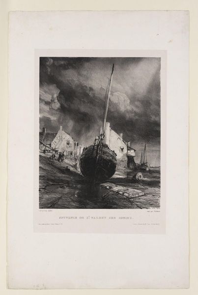 'Memory of Saint-Valéry-sur-Somme' is an etching made by Eugène Isabey, capturing a slice of 19th-century French coastal life. Isabey, who navigated the shifting landscapes of Romanticism and Realism, here presents more than just a maritime scene. Consider the implications of memory embedded in the title, and the labor invested in the ship. What stories do these boats hold? What dreams sail with them? The etching encapsulates a moment of transition, reflecting the growing industrialization and urbanization that pushed many to seek solace or livelihood by the sea. We see a vessel, sturdy yet still vulnerable to the elements. Isabey invites us to reflect on the ever-changing relationship between humanity and the sea, intertwining personal emotions with broader societal shifts.