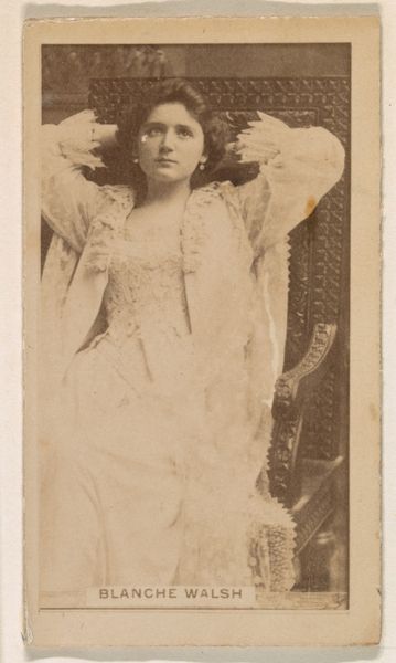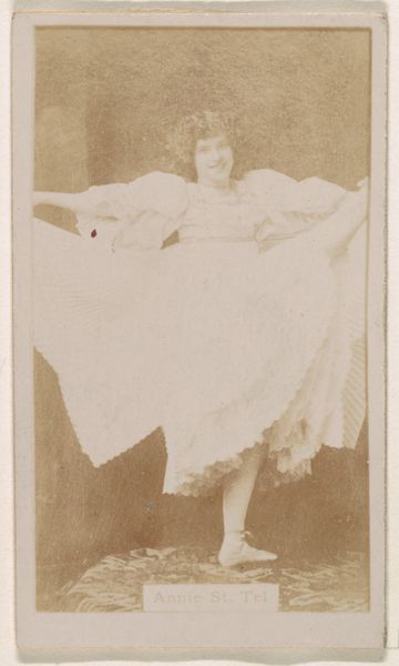 Editor: This is “Annie St. Tel, from the Actresses series (N245) issued by Kinney Brothers to promote Sweet Caporal Cigarettes,” created in 1890. It's a photographic print. There's something ethereal and delicate about it, but also… faded, almost like a memory. What do you see in this piece? Curator: A daydream! I imagine plumes of Sweet Caporal smoke curling around a vaudeville stage. Kinney Brothers weren’t just selling cigarettes; they were selling a fantasy. It's impressionistic in its soft focus. What does Annie's pose evoke for you? Do you think of ballet or theatre? Editor: Definitely theatre! Her expression is so direct, almost confrontational. It makes me think about the women on stage at the time; were they just pretty faces, or did they have some agency? Curator: Agency, definitely. Consider the context: late 19th century, women were fighting for more control. The stage offered a platform, even within the constraints. This image, distributed with cigarettes, brings Annie, and her performance, into parlors and men's clubs across the country, expanding her reach in ways she may not have imagined. A small paper object with grand ambitions. What are you left wondering about? Editor: I’m wondering what happened to Annie. Did this cigarette card lead to something bigger? It’s interesting to consider a work of art created to advertise something else – a real intersection of commerce and culture. Curator: Exactly! It proves art finds a way, even when wrapped in tobacco. I leave thinking about the role of photography to blur the lines between fame, performance, and daily life at the end of the 19th Century.