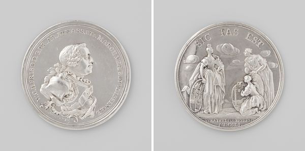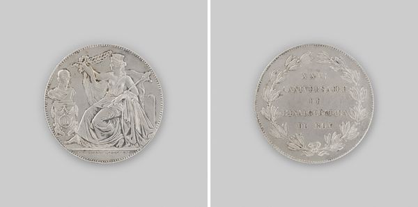 Curator: Here we have a medal created in 1830 by Joseph-Pierre Braemt, marking a rather turbulent moment in history, the outbreak of the Belgian Revolution. It's a fascinating artifact in metal, combining sculpture and engraving. Editor: It’s cold to the touch just imagining it! Seeing it, it feels… classical and terribly serious. It is a controlled burn that gives me vibes of order… maybe a little too much order, like an emperor trying to arrange a cloud. Curator: Exactly! That classical feel is deliberate; this medal aligns with the Neoclassical style that was popular then, echoing ancient Greek and Roman art to evoke ideas of civic virtue and order. You notice the figure of the helmeted woman? That's an allegorical representation meant to suggest wisdom and civilization, and it's tied directly to the then-king, Willem I. Editor: So it is less a celebration of the revolution and more… a backhanded compliment? Or an attempt to rewrite history in real-time? "Wisdom," when revolution is brewing... It smacks of trying too hard. Who are these medals for, anyway? Were these like commemorative coins, attempts to influence the popular imagination, you think? Curator: Precisely! Medals like these served a propagandistic purpose. They were often distributed among the elite and officials, aimed at shaping perceptions of events and bolstering support for the ruling power. Note the inscription "AESTVANTE EVROPA BELG. FOEDER STABILIS PACIS ARX," suggesting Belgium is a bulwark of stable peace during a turbulent Europe. Talk about spin! Editor: (laughing lightly) Oh, the audacity of it! Still, I can appreciate the craft, the engraving detail is exquisite. The laurel wreath on the reverse—so perfect, so contained, but still… beautiful, yes? Perhaps the tension between the ideal and the reality is what makes it so interesting, artistically. This really allows us to delve into how powerful imagery and iconography may tell one tale while perhaps hiding or suppressing another, richer, narrative. Curator: Indeed. The artistry is undeniable, regardless of the political message it carries. Braemt's skill in relief and engraving is evident. It’s a powerful little object—it's a physical artifact of a specific political moment, and a visual statement of how that moment was intended to be understood. It definitely prompts reflections on how historical narratives get crafted and circulated. Editor: Well, now that I better understand it, it feels like a pocket-sized lesson about perspective… how history really gets shaped and marketed! I will never see historical symbols quite the same. Thank you.