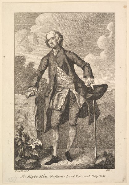 Curator: This is an engraving made in 1796 by Gerhard Ludvig Lahde, titled "Frederik Christian, Hertug af Slesvig," which translates to "Frederick Christian, Duke of Schleswig." It's part of the collection here at the SMK, Statens Museum for Kunst. Editor: My first thought is this embodies a cool detachment. It's classically composed, yes, but almost stark in its representation. I find it difficult to emotionally connect. Curator: Neoclassical art, particularly portraiture, often presents a subject through the lens of idealization and restraint. Lahde aimed to show Frederick Christian embodying the virtues and characteristics associated with his rank and role. Consider the crispness of line. Editor: Precisely. This piece underscores how powerful interests embed themselves in the art of the period. Even his garments serve a function—communicating class, power, belonging. Everything in this portrait reinforces status. Curator: Absolutely, the Duke's attire is a potent display of social position. The decorations are designed to emphasize heritage, influence, and alliance through visual means. Note his hand casually placed within his waistcoat, connoting inner resolve, strength, a cultivated elegance. Editor: Which contributes to the almost austere feel. It reflects a world shifting towards rationality and away from overt displays of emotion, where self-representation became a tool to craft one's persona for public consumption. It's political communication formalized. Curator: True, yet consider the symbolism. The landscapes and architectural elements subtly amplify his governance of the territories over which he held dominion, with connotations of duty and stewardship. It's like he’s not merely presented, he's enshrined. Editor: And art becomes a reflection and constructor of social order. By studying who gets depicted, and how, and through what mediums, we unlock broader understandings about historical power dynamics and evolving norms of display. Curator: Analyzing it helps reveal so much about cultural and political systems! It truly resonates still. Editor: Yes, precisely. Artworks are living history. Thanks for unpacking this Lahde piece with me; it's clarified my perceptions!