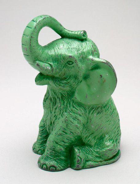 Curator: This captivating object before us, dating from the 1930s, is an Art Deco elephant still bank, produced by the Arcade Manufacturing Company. Editor: What strikes me first is its vibrant hue. That intense orange disrupts any expectation of the material's coldness and announces its presence so boldly. Curator: The piece, rendered in metal, embodies the streamlined aesthetic characteristic of the Art Deco era. Consider how the object serves the dual purpose of artistic expression and utilitarian function. Editor: Right, notice how its design simplifies the animal to geometric planes. This faceting introduces angularity, especially noticeable around the trunk and back. How would you analyze that visual language? Curator: I’m drawn to consider the socioeconomic factors informing the Arcade Manufacturing Company’s work, where functionality and decoration merge as they created affordable and appealing designs. The consumption and reception are central. Editor: Indeed. Now, if we examine this elephant in isolation, the color suggests fire. But the rust and mottled surfaces betray it—a sign of past lives of hard handling and weather! It hints at some story behind the object’s production and circulation. Curator: Definitely. It’s compelling how these "still banks," popular during the period, incentivized savings—linking everyday activities to broader ideals, revealing both production values and consumer appeal. Editor: The scale suggests personal ownership, its presence both playful and pedagogical, alluding both to value and decorum. Its form captures both a historical era, and that bygone appeal that we can still connect with today. Curator: Yes, an understanding of production and context really can unlock many ways to appreciate an art object such as this. Editor: Agreed, together the surface and form capture so much in one glance. The Deco lines certainly deliver something more than just metal and geometry!