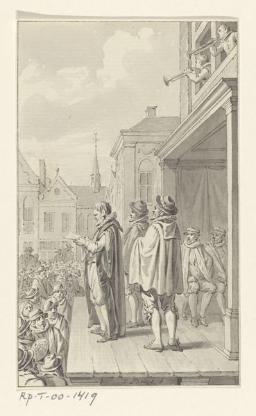 Reinier Vinkeles created this engraving, "Proclamation of the Pacification of Ghent, 1576," in the late 18th century, a time of significant political and social change in Europe. The image depicts a pivotal moment in Dutch history, the announcement of an agreement intended to bring peace between the rebelling Dutch provinces and Spain. Vinkeles, working long after the actual event, taps into a collective memory and shapes a narrative about Dutch identity. The figures on the platform, rendered with a certain formality, contrast with the crowd below, their faces a mix of anticipation and skepticism. What did this "peace" truly mean for them? Engravings like this were often used as propaganda, reinforcing certain values and historical interpretations. Vinkeles’ work invites us to consider how historical events are framed and remembered, and whose stories are prioritized in the construction of national identity. What does it mean to depict such an event during the Enlightenment, and how might Vinkeles’ own political context have influenced his portrayal?