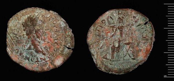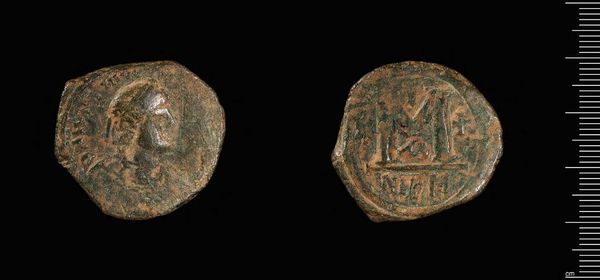 Curator: This object is a Half-Stavraton, a coin minted by Manuel II. Editor: The patina! The colors feel so aged, but the details still have a voice—a quiet, weathered strength. Curator: Note the carefully inscribed images—Manuel himself on one side, and religious iconography on the other. The very form, size, and composition speak to power and authority. Editor: Power inextricably linked with religious and cultural identity in the Byzantine world. What did it mean to hold such a coin during a period of political instability? Curator: The coin's value wasn't merely monetary; it visually communicates Manuel's claim to the Byzantine throne through established artistic symbols. Editor: Each element serves as a tiny billboard, broadcasting ideology across social strata, reinforcing existing power structures through material culture. Curator: Indeed, its artistry is inseparable from its purpose. Editor: Considering its scale and age, this coin offers a tangible connection to the complexities of late Byzantine history.