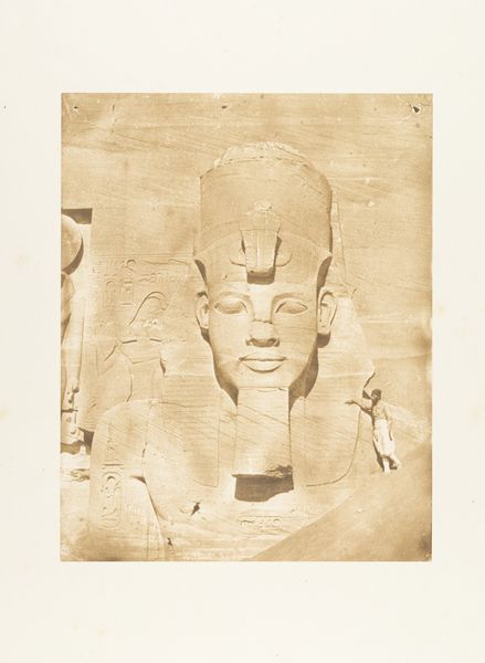 This photograph of the collosal head of Ramses II at Abu Simbel was made by Maxime Du Camp in 1850, using the Calotype process. Du Camp was part of a literary and scientific mission to the Near East, but his photographs became important documents of early Egyptology. The inclusion of a human figure in the frame, which was a common practice at the time, gives us a sense of the monument's size, but it also speaks to the colonial context of the photograph. The statues at Abu Simbel served to convey the power of the Pharaoh, both to his contemporaries and to posterity. Du Camp’s photo comes at a time when European institutions sought to exert cultural dominance over foreign lands by appropriating artifacts. Photography played a key role in this project, with photos such as this becoming source material for scholarly interpretation and artistic re-imaginings. Analyzing Du Camp’s image alongside travelogues, archeological reports and other visual representations of Egypt from the period, will give a better understanding of the cultural and institutional forces at play.