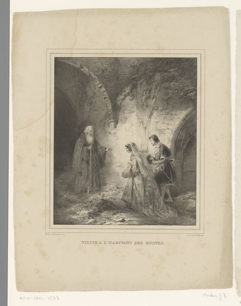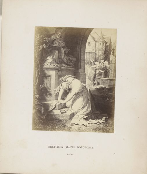 This photogravure reproduces Wilhelm von Kaulbach's drawing of Gretchen on her way to church from Goethe's "Faust." The monochromatic tones and sharp lines create a somber, almost haunting atmosphere. Notice how the composition is structured around the central figure of Gretchen, her form depicted with a delicate contrast to the shadowed figures lurking on the periphery. The artist uses line and shadow to construct a visual hierarchy, with Gretchen illuminated as a focal point against the darker, more ambiguous shapes surrounding her. This contrast can be interpreted through a structuralist lens. The artwork uses binary oppositions – light and shadow, innocence and darkness – to explore themes of morality and temptation. The composition challenges conventional notions of virtue and vice, with Gretchen’s purity destabilized by the looming presence of Faust and Mephistopheles. The play of light and shadow invites us to consider how the artwork invites us to explore the dualities inherent in the narrative of "Faust," engaging with questions of sin, redemption, and the human condition.